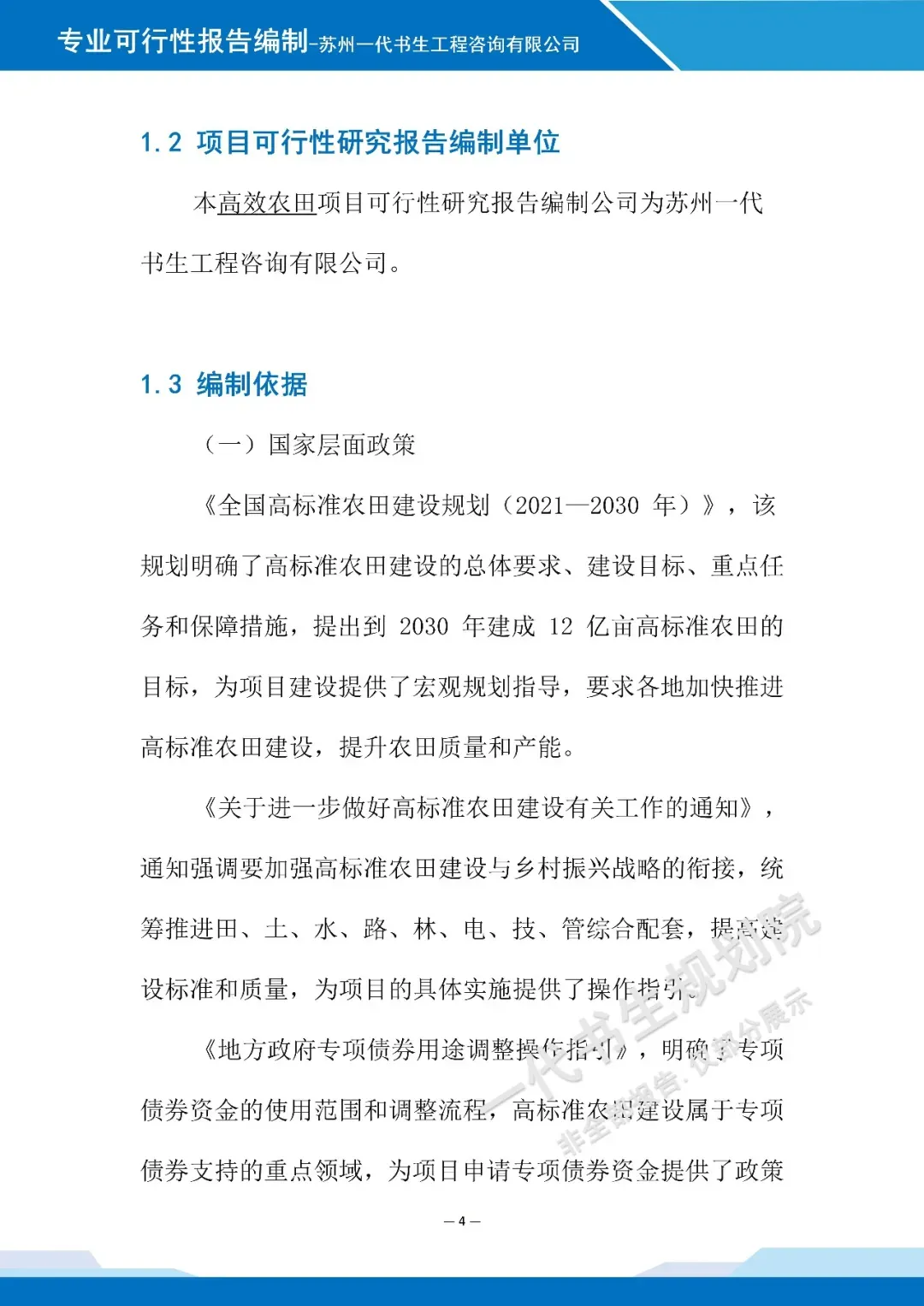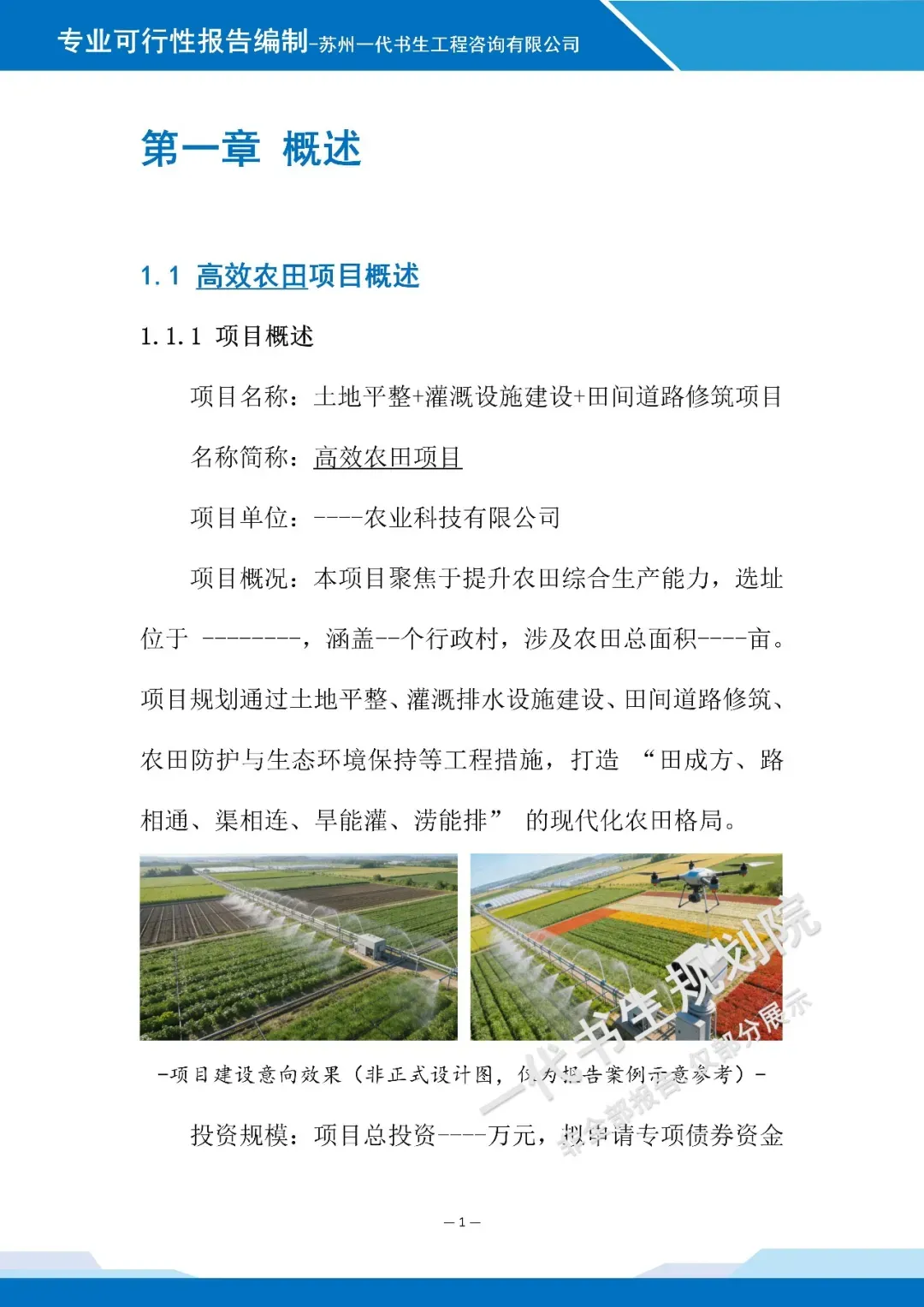 《高效农田项目土地平整+灌溉排水设施+田间道路综合工程一体化建设可行性研究报告》由苏州一代书生工程咨询有限公司出具,该公司集市场评估、产业策划与规划设计于一体,可提供项目建设前期评估、落地规划设计等服务,出具各类行业报告及规划方案,保障报告专业性与实用性。