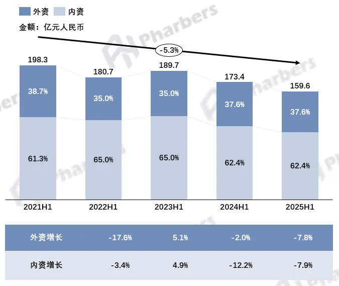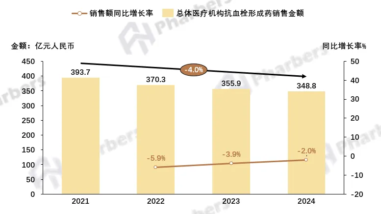 2021-2024年,受集采常态化与医保控费的影响,我国总体医疗机构抗血栓形成药市场规模持续收缩,但跌势逐渐放缓。法伯全渠道数据显示,该药物市场规模从2021年的393.7亿元降至2024年的348.8亿元,四年累计下降11.4%,复合年增长率为-4.0%。