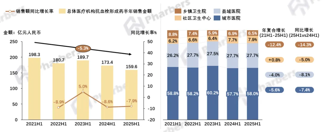 2025年上半年,抗血栓形成药市场规模为159.6亿元,较2024年上半年的173.4亿元同比下降7.9%。渠道结构相对稳定,城市医院始终占据60%左右的市场份额,县域医院则在27%左右,但各渠道均呈现同比下滑态势,其中乡镇卫生院降幅最为显著,2025年上半年规模同比下降14.3%。