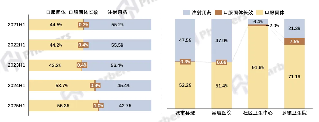 剂型上,注射用药与口服固体此消彼长:注射用药占比从2021年上半年的55.2%持续下滑至2025年上半年的42.7%,口服固体占比同步提升,其中,口服固体长效制剂占比由0.3%稳步升至1.0%。