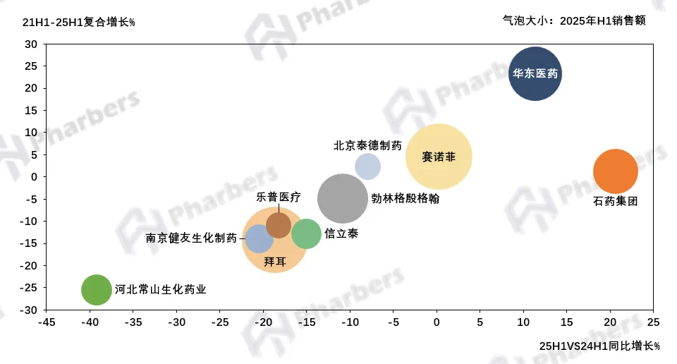 TOP企业中,内资有7家,外资3家。其中内资企业华东医药凭借吲哚布芬相关产品的快速增长,带动公司整体销售额提升,2025年上半年同比增长超10%;石药集团则依托替格瑞洛、重组人TNK(替奈普酶)组织型纤溶酶原激活剂等核心品种实现稳健增长,2025年上半年同比增长同样超10%。外资企业整体表现相对稳健,其中赛诺菲增长态势最优,复合增速与2025年上半年同比增速均实现正向增长。
