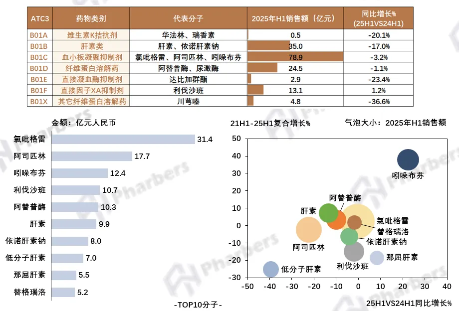 其实,从药物品类来看,吲哚布芬所属的血小板凝聚抑制剂无疑是绝对霸主。2025年上半年,该品类销售额已超78亿元,占总市场近50%。