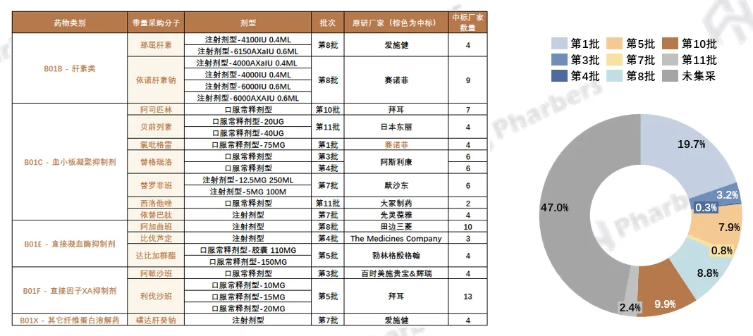 集采方面,据法伯整理,在已执行的十一批集采中,抗血栓形成药物市场共有15个核心分子被纳入,覆盖5个主要品类,其销售规模合计占2025年上半年整体市场份额的53.0%。其中原研产品仅赛诺菲的氯吡格雷在第1批集采中中标。