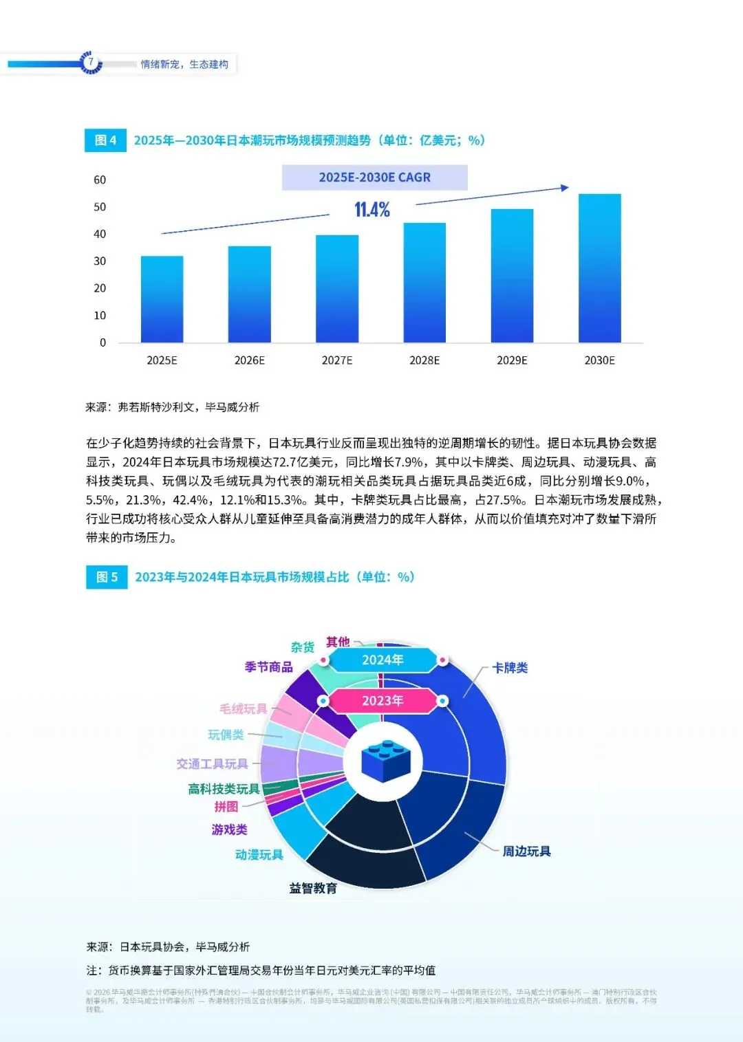 从全球范围来看,潮玩行业保持着良好的增长势头。2024 年全球潮玩行业市场规模为 418 亿美元,同比增长 14.2%,预计 2025 年将达到 520 亿美元,年均增长率超过 20%。作为潮玩行业的发源地之一,日本市场发展相对成熟,预计到 2030 年,日本潮玩市场将达到 55 亿美元规模,年均复合增长率约为 11.4%。在少子化趋势持续的社会背景下,日本玩具行业反而呈现出独特的逆周期增长韧性。2024 年日本玩具市场规模达 72.7 亿美元,同比增长 7.9%,其中潮玩相关品类占据玩具品类近 6 成,卡牌类玩具占比最高,达到 27.5%。日本行业成功将核心受众从儿童延伸至具备高消费潜力的成年人群体,以价值填充对冲了数量下滑带来的市场压力。