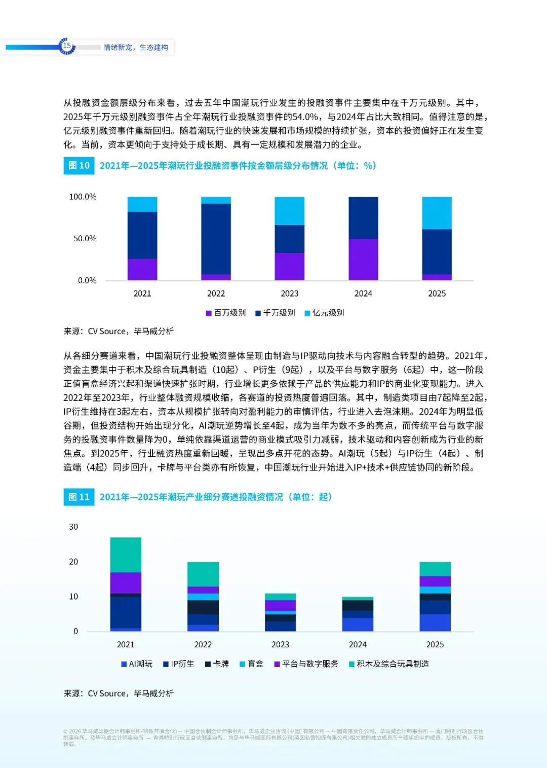 2024 年为明显低谷期,但投资结构开始出现分化,AI 潮玩逆势增长至 4 起,成为当年为数不多的亮点。而传统平台与数字服务的投融资事件数量降为 0,单纯依靠渠道运营的商业模式吸引力减弱,技术驱动和内容创新成为行业的新焦点。到 2025 年,行业融资热度重新回暖,呈现出多点开花的态势。AI 潮玩与 IP 衍生、制造端同步回升,卡牌与平台类亦有所恢复,中国潮玩行业开始进入 IP 加技术加供应链协同的新阶段。