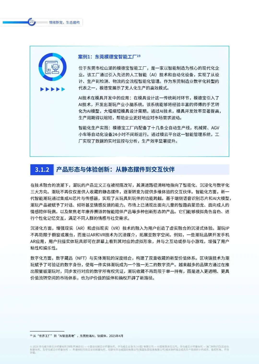 产品形态与体验创新方面,潮玩的产品定义正在被彻底改写,其演进路径清晰地指向了智能化、沉浸化与数字化三大方向。潮玩不再仅仅是供人收藏的静态摆件,逐渐转变为提供多维体验的交互伙伴。智能化方面,新一代智能潮玩通过集成 AI 芯片与传感器,实现了从玩具到玩伴的功能跨越。基于端侧语音识别芯片和 AI 大模型,潮玩产品被赋予了对话、倾听甚至情感反馈的能力。市场上已涌现出面向儿童的智趣启蒙恐龙、面向成人的情感陪伴玩偶,以及聚焦老年康养赛道的智能陪伴产品等多种创新形态的产品。它们能够模拟角色音色、进行个性化记忆交互,满足不同人群的情感与社交需求。