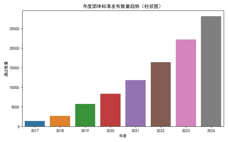 数量爆发式增长:发布量从 2017 年约 2000 项激增至 2024 年 27000 项,年均增长率达 67.2%,但部分领域存在 “重数量轻质量” 现象;