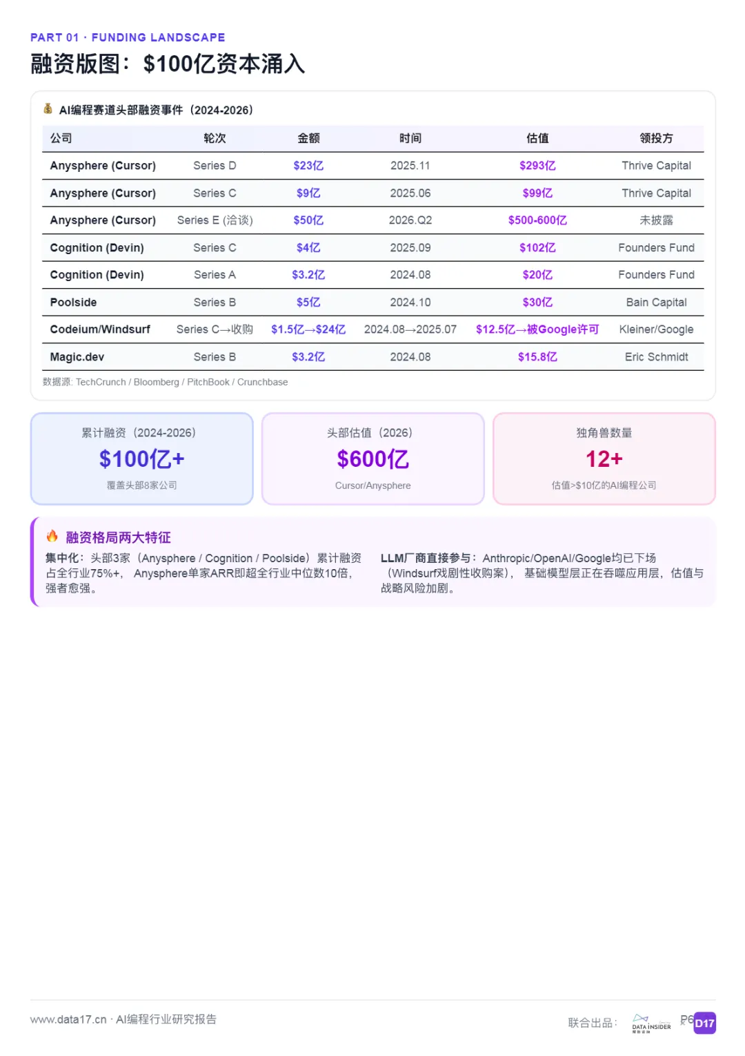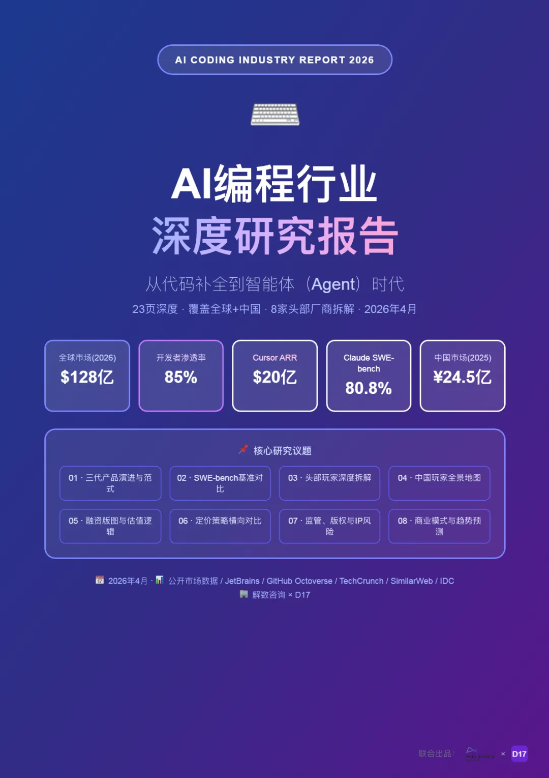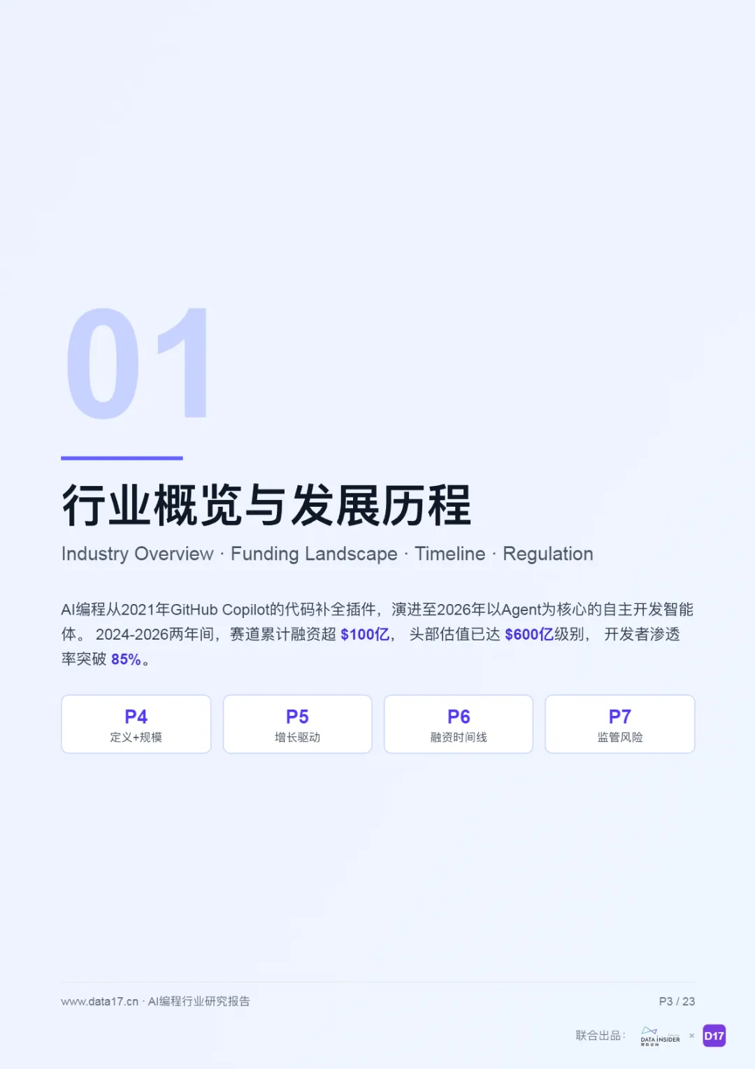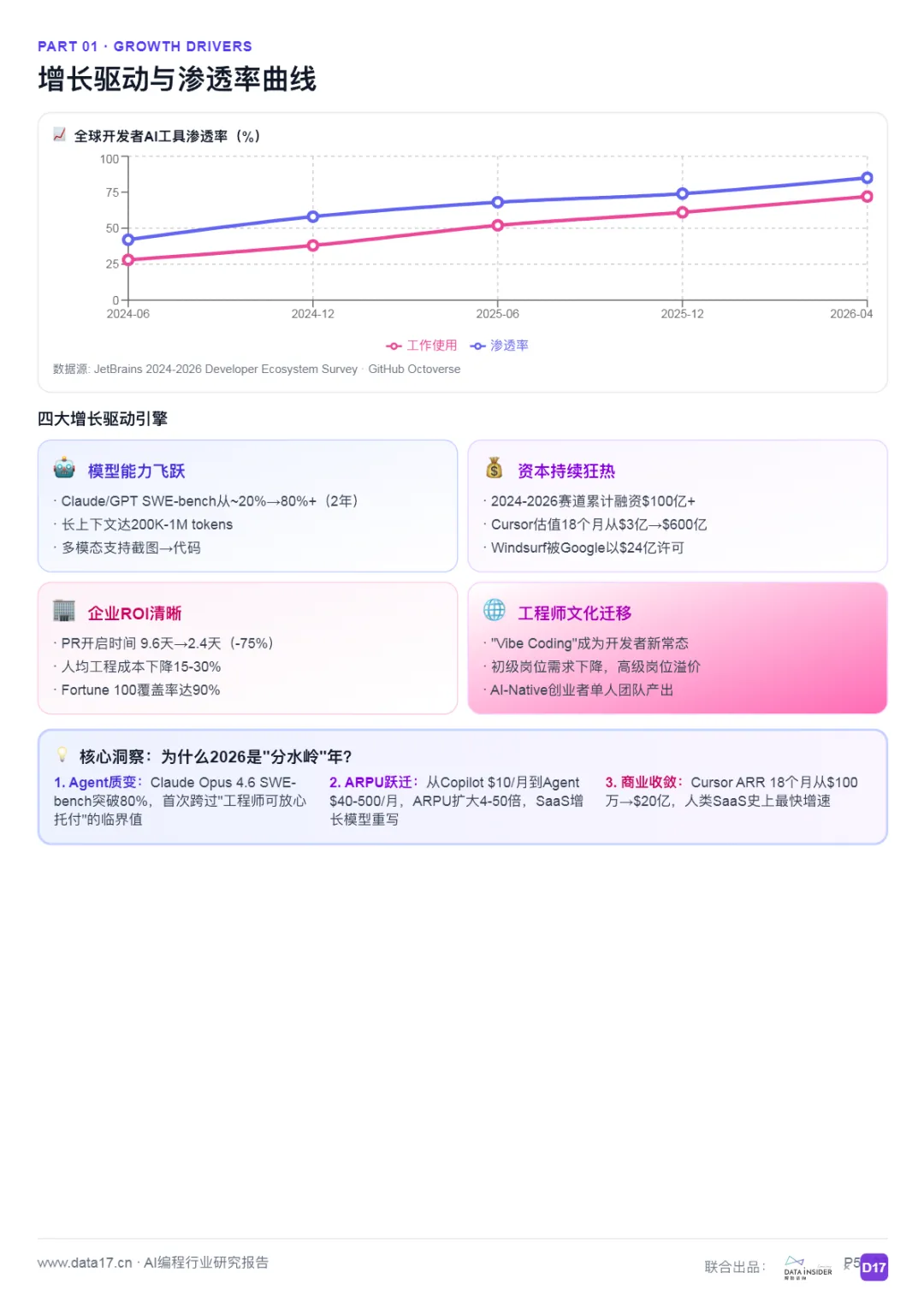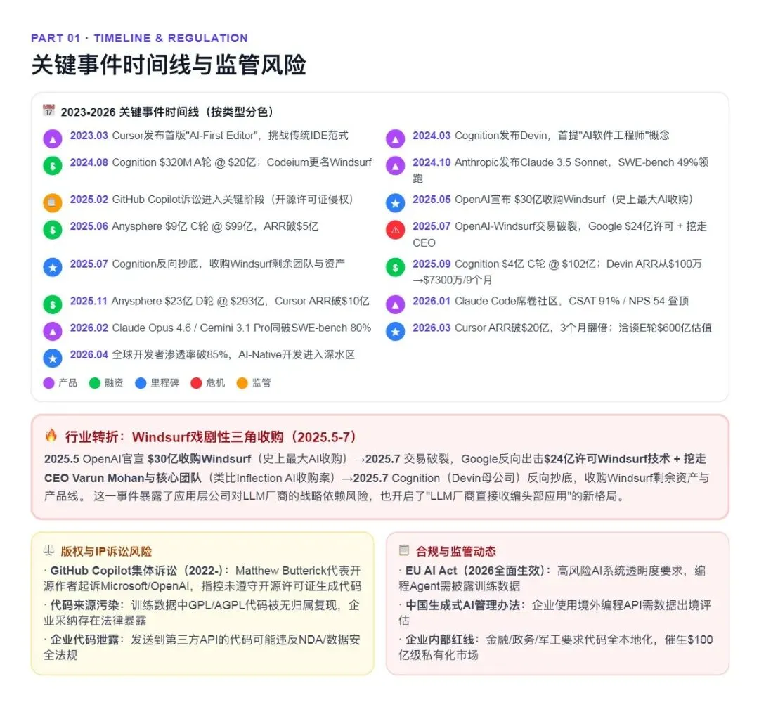 AI编程从2021年GitHub Copilot的代码补全插件,演进至2026年以Agent为核心的自主开发智能体。2024-2026两年间,赛道累计融资超$100亿,头部估值已达$600亿级别,开发者渗透率突破85%。