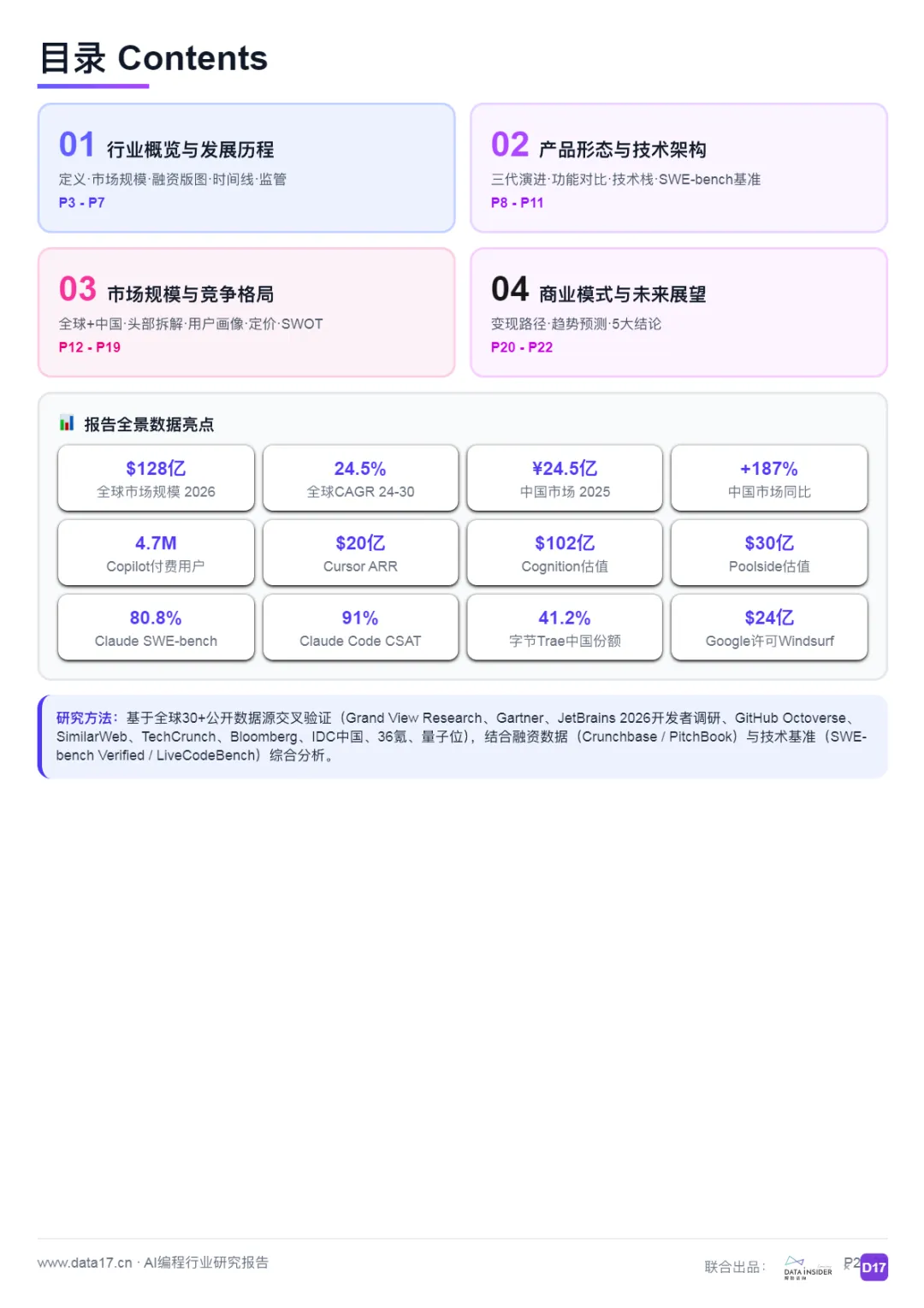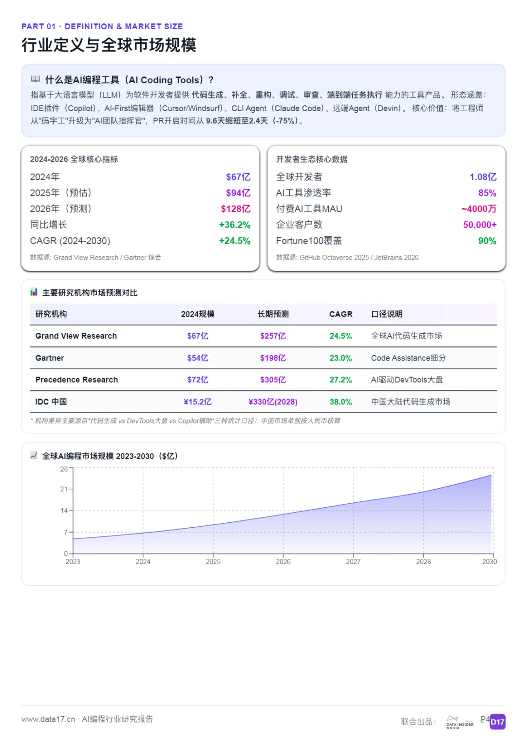 指基于大语言模型(LLM)为软件开发者提供代码生成、补全、重构、调试、审查、端到端任务执行能力的工具产品。形态涵盖:IDE插件(Copilot)、AI-First编辑器(Cursor/Windsurf)、CLI Agent(Claude Code)、远端Agent(Devin)。核心价值:将工程师从"码字工"升级为"AI团队指挥官",PR开启时间从9.6天缩短至2.4天(-75%)。