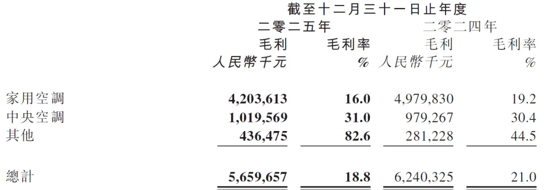 盈利能力的恶化直接体现在毛利率上,奥克斯电气2025年综合毛利率从2024年的21%下降至18.8%,毛利总额从62.4亿元降至56.6亿元。对于本就以薄利多销著称的奥克斯电气而言,超过2个百分点的毛利率下滑,对其利润的侵蚀效应被显著放大。