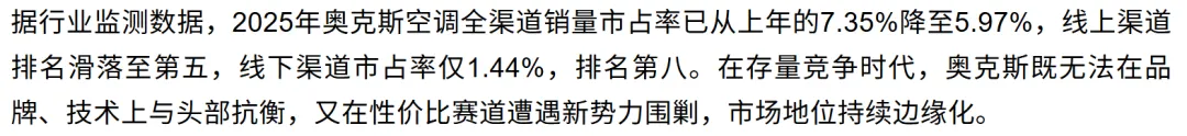 据《赛迪网》报道,行业监测数据显示,2025年奥克斯电气空调全渠道销量市占率已从上年的7.35%降至5.97%,线上渠道排名滑落至第五,线下渠道市占率仅1.44%,排名第八。
