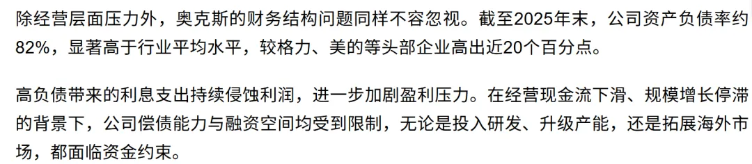 截至2025年末,奥克斯电气资产负债率高达约82%,显著高于行业平均水平,较格力、美的等头部企业高出近20个百分点。据《赛迪网》分析,高负债带来的利息支出持续侵蚀本已稀薄的利润,在经营现金流下滑、规模增长停滞的背景下,奥克斯电气的偿债能力与后续融资空间均受到限制。