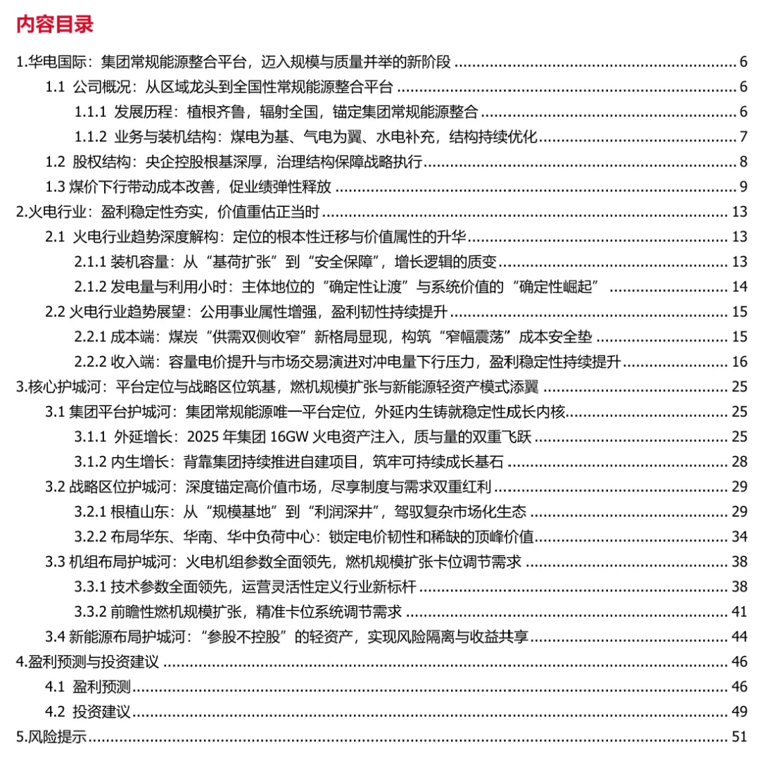 站在当前时点展望未来,我们认为火电板块正由周期属性逐步转变为公用事业属性,整个行业虽面临电量空间受挤压的持续挑战,但其盈利的稳定性和韧性预计将得到显著增强。驱动因素来自成本端的“减震”和收入端的“扩容”,华电国际作为行业领先企业,具备平台赋能、区位布局、机组效率、灵活调节、政策支持等优势,有望持续获取超越行业的α收益。
