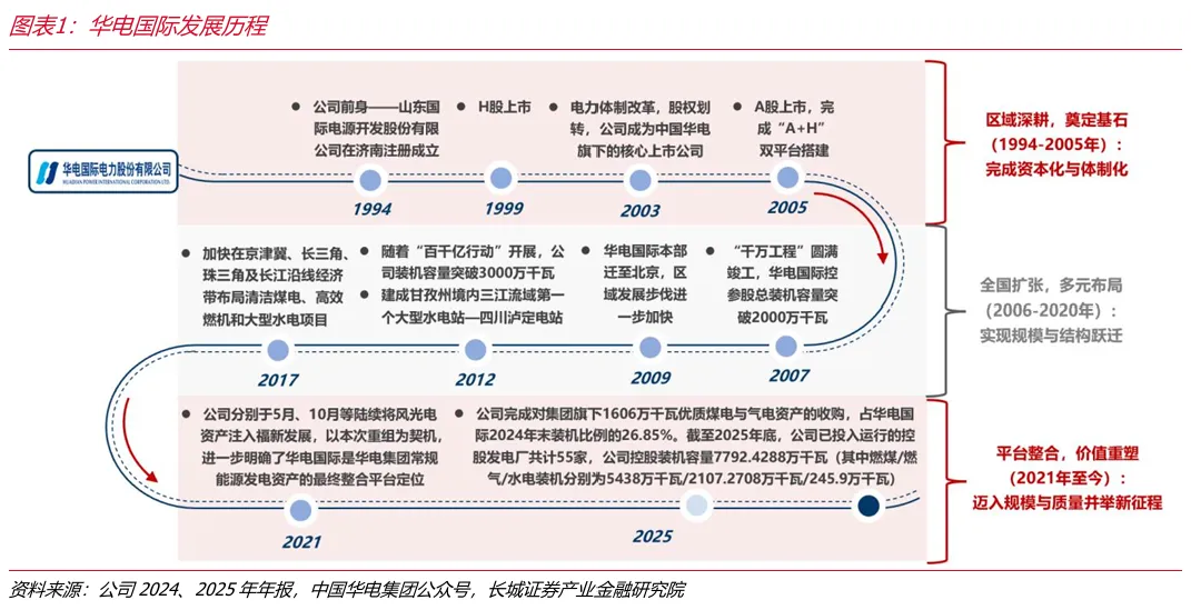 公司前身山东国际电源开发股份有限公司于1994年在济南成立,以邹县、十里泉电厂为起点,深度植根于山东这一经济与用电大省,专注于省内火电项目的开发与运营,建立了坚实的运营基础与区域市场优势。此阶段的里程碑在于成功对接资本市场并明确央企归属[1] :1999年,公司发行H股,成为早期登陆国际资本市场的中国电力企业之一;2003年,在电力体制改革中股权划转至中国华电集团,成为其核心上市子公司;2005年,公司在A股上市,构建起 “A+H”双融资平台,为后续的全国扩张储备了关键的资本动能[2]。