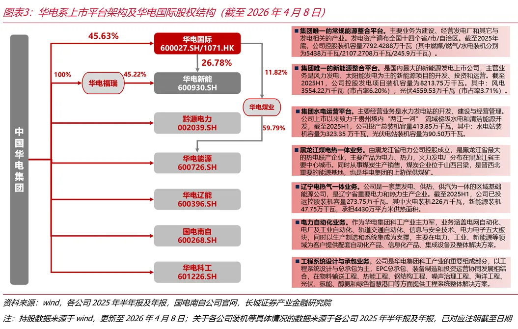 治理结构保障战略定力,“双平台”与“轻参股”拓宽发展空间。公司独特的“A+H”双上市平台,不仅拓宽了境内外融资渠道、优化了资本成本,也吸引了注重长期价值的国际投资者,促进了公司治理的国际化与市场化。而稳固的央企控股背景,使管理层能够专注于执行长期产业战略,有效抵御短期市场波动干扰。与此同时,公司通过创新的资本运作参与能源转型:在2021年向集团新能源平台华电新能注入风光资产并现金出资,从而战略性地持有其股份(截至2026年4月8日,持股比例为26.78%),进一步优化了资产结构与利润来源、增厚了成长机遇。
