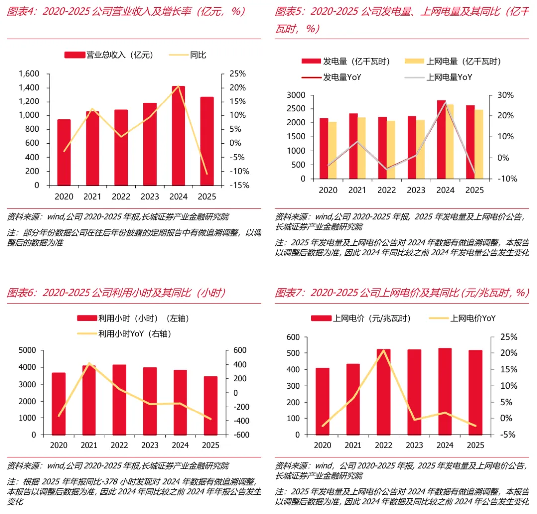 能源转型阵痛致量价承压,营收表现短期受限。公司营收规模在经历早期增长后,自2024年起进入平台期并略有下滑。2025年,公司实现营业收入1260.13亿元,同比-10.95%。这一趋势主要受两大因素压制:一方面,发电量受到系统性挤压。在新能源装机快速增长的背景下,公司火电机组利用小时数承压,2025公司发电机组平均利用小时为3427小时,比追溯调整后的上年同期数据下降约378小时。其中燃煤发电机组的利用小时为3,874小时,比上年同期下降294小时;燃气发电机组的利用小时为2,128小时,比上年同期下降24小时。机组利用率下降进一步导致发电量下滑,2025年公司累计完成发电量2622.70亿千瓦时,较上年追述调整同比-6.99%。累计实现上网电量2464.43亿千瓦时,较上年追述调整同比-7.09%。这反映出在当前的电力供需格局下,公司火电资产正从提供基础电量的主力电源,加速向承担调峰、备用功能的调节性电源转变;另一方面,市场化电价稳中略降。2025年公司平均上网电价约为513.29元/兆瓦时,较上年追述调整同比下降约2.34%。