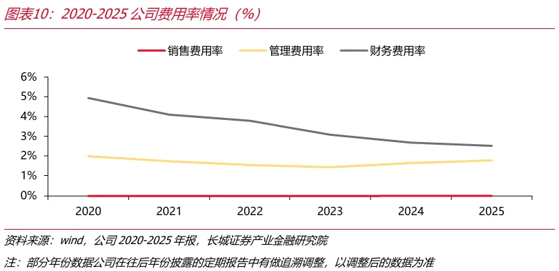 费用管控严谨且积极,财务结构优化减轻负担。2025年,销售费用率、管理费用率、财务费用率分别保持在0.00%、1.77%和2.51%的合理水平。其中,受益于公司加大资本运作以及融资成本降低的影响,财务费用同比减少约16.37%,财务费用率显著下降,同比-0.35pct。严谨的费用管控与积极的负债管理,共同为净利润的释放提供了有力保障,进一步增强了公司的业绩弹性。
