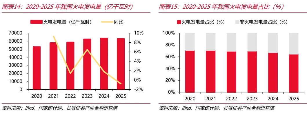 发电量:2025年稍有回落,系统主体地位加速让渡。从绝对值看,“十四五”期间,全国火电发电量持续增长,从“十三五”末(2020年)的5.28万亿千瓦时增长至2024年的6.34万亿千瓦时,创历史新高,这充分体现了其在电力保供中的“兜底”作用。然而,2025年火电发电量6.29万亿千瓦时,同比-0.78%,稍有回落。另一方面,火电作为电力供应主体的地位正确定性、趋势性让渡。火电占全国总发电量的比重从2020年的71.19%下降至2025年的64.79%。