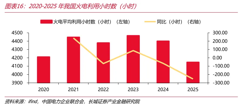 利用小时数:趋势性下降确认转型,收益模式重塑加速。与发电量紧密关联的设备平均利用小时数,“十四五”期间在经历因缺电导致的短暂反弹后,已进入趋势性下行通道。2025年全年,全国火电平均利用小时为4146.62小时,较2024年同期水平下降253.38小时,展望“十五五”,随着新能源装机容量的持续扩张,火电的加速让渡,这一趋势或将更加明确。