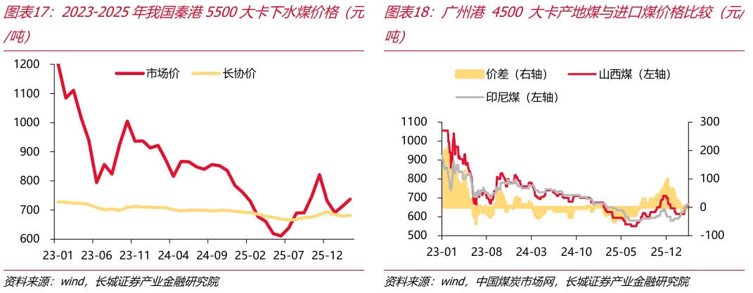 2025年煤价下行释放业绩弹性,预期未来中枢企稳托底盈利。燃料成本占火电营业成本的一半以上,是火电盈利波动的核心来源之一。回顾2025年煤价走势,2025年上半年,煤价同环比持续下降,低至610元/吨左右,显著减轻成本压力,成为驱动火电业绩强势反弹的“β红利”。下半年虽有供给扰动导致的阶段性冲高,但暖冬压制需求、库存高企,最终驱使煤价理性回落。展望未来,“稳煤价”的政策定调将与供需新格局形成共振,需求侧受新能源挤压步入平台期,供给侧受安全环保约束保持克制。这种“供需双侧收窄”的局面,将驱动煤价脱离宽幅周期波动,转而进入围绕“长协基准价”上下进行窄幅震荡的成熟市场形态。这种新常态意味着,类似2021-2022年那种成本快速拉升的极端场景难以重现,为火电企业提供了一个更可预测、更可控的成本环境,构成了火电盈利的“成本安全垫”。