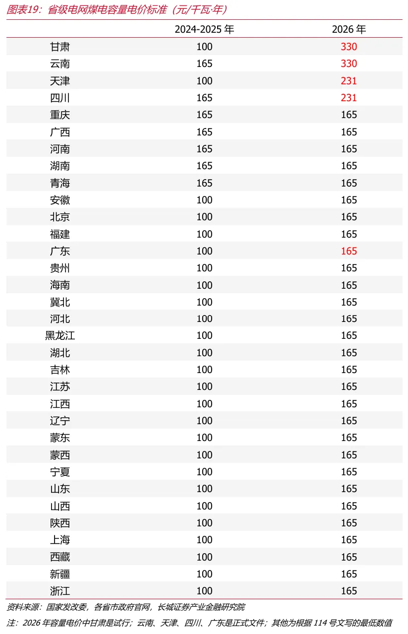 [14] 假设依据:根据《关于完善发电侧容量电价机制的通知》(114号文),各省2026年煤电容量补偿比例不低于50%,并允许地方进一步提高,加上云南、甘肃等地已经提高到更高的水平,因此我们假设2026年全国平均容量补偿比例为55%。