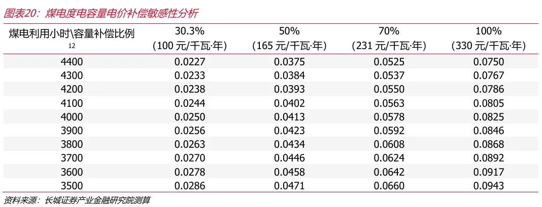 容量电价提升能有效补偿煤电利用小时数下降带来的盈利压力,显著增厚度电利润。从单台设备来看,以一台60万千瓦的煤电机组为例,其年度容量电费收入将从约6000万元(100元/千瓦·年*60万千瓦)提升至9900万元(165元/千瓦·年*60万千瓦),增幅达3900万元。这部分收入与发电量无关,是纯粹的“备用租金”,将直接增厚度电利润,并大幅平滑因利用小时波动带来的业绩影响。考虑到新能源装机快速上升对煤电利用小时数造成挤压已成为确定性趋势,我们对煤电度电容量电价补偿进行敏感性分析。测算发现,随着容量电价提升以及煤电利用小时数下降,煤电度电容量电价随之提升,将有效增强煤电盈利的稳定性。