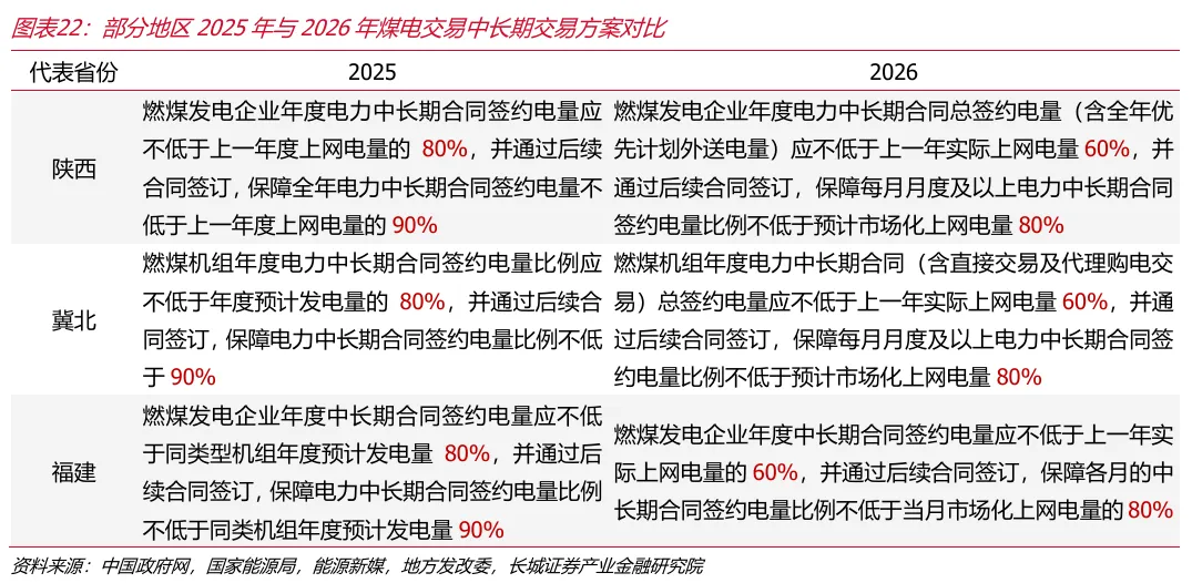 多地2026年电力中长期交易方案已呈现年度签约比例结构性下调、月度、月内、现货交易占比提升的政策导向。以陕西省为例,2025年要求燃煤发电企业年度中长期合同签约电量应不低于上一年度上网电量的80%,并通过后续合同签约保障全年签约比例不低于90%;而2026年方案则将年度签约比例的硬性要求下调至不低于上一年实际上网电量的60%,转而通过保障每月月度及以上中长期合同签约电量比例不低于预计市场化上网电量的80%,来实现总体签约水平的稳定。冀北地区、福建同样也呈现类似趋势。这种“降年协、增月协和现货”的结构性调整,使得电价能够更灵敏、更及时地反映煤炭成本与系统供需的实时变化,从源头上缓解了“市场煤、计划电”的错配矛盾,增强了煤电价格联动的韧性和连续性。
