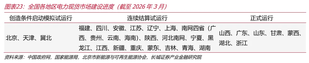 现货市场完善煤电联动,煤炭成本传导的连续性提升。2025年4月,《关于全面加快电力现货市场建设工作的通知》(394号文)发布,明确要求“2025年底前基本实现电力现货市场全覆盖,全面开展连续结算运行”。“394号文”发布以来,电力现货市场建设加速推进。南方区域电力市场转入连续结算运行,电力资源在南方五省区统筹互济取得突破进展。截至2025年12月,山西、广东等7个省级现货市场已转入正式运行。我国省级电力现货市场已实现基本全覆盖。此外,2026年2月,国务院办公厅发布《关于完善全国统一电力市场体系的实施意见》,进一步明确时间表:到2027年前现货市场基本实现正式运行,到2030年基本建成全国统一电力市场体系,市场化交易电量占全社会用电量的70%左右[17]。现货市场的核心价值在于“即时发现价格、顺畅传导成本”——当煤炭市场价格上涨时,反映系统实时供需紧张程度和发电边际成本的现货电价也将随之上涨,反之亦然。随着现货市场加速推进,电价对煤炭成本的传导从过去以“年度长协”为主的迟缓、离散模式,转变为通过“现货市场”实现的即时、连续模式,使火电企业能够将燃料成本的波动即时传导至电价端,显著平滑了燃煤成本对利润的直接影响。