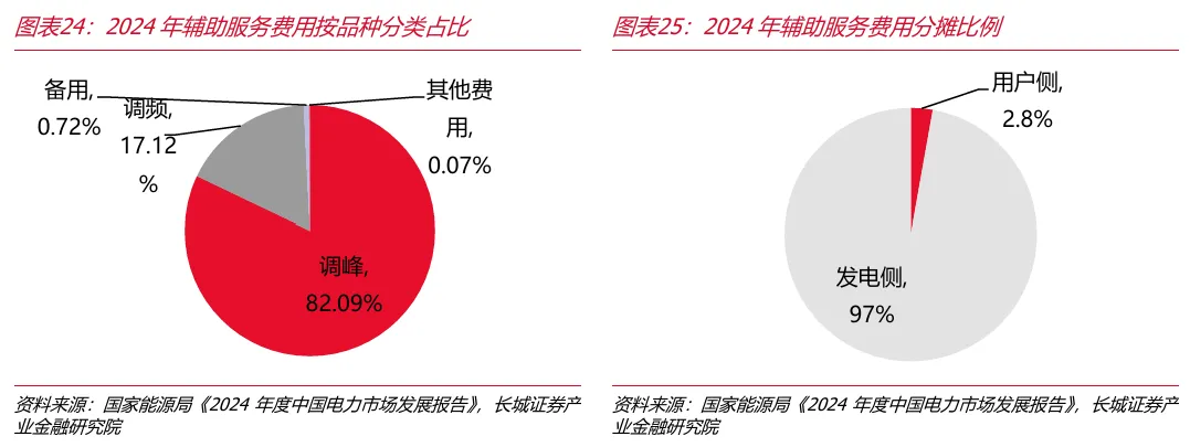 辅助市场服务市场空间可观,且增长潜力大。根据国家能源局《2024年度中国电力市场发展报告》,2024年全国辅助服务费用达402.5亿元,其中调峰占比82.09%(330.4亿元)。从结构来看,调峰是当前辅助服务市场的主体,但其内涵正在发生深刻变化。随着新能源渗透率提升,火电机组从基荷电源向调节主力转型,通过市场化辅助服务收益激励,煤电机组平均调峰深度从40%提升至60%,部分深度调峰改造机组可达70%-80%。国家发展改革委数据显示,“十四五”前三年,我国已完成煤电节能降碳改造、灵活性改造和供热改造超7亿千瓦。2025年4月发布的《新一代煤电升级实施方案》进一步提出六项高效调节指标,包括供电煤耗、低负荷煤耗攀升幅度、深度调峰最小出力、负荷变化速率、一次调频能力、启停调峰能力要求。相关研究表明,煤电灵活性改造是我国电力系统现有灵活性资源中成本较低的品种之一,若充分实施灵活性改造,到2027年可释放5600万千瓦的灵活性调节空间;若进一步推动启停调峰普及,中远期可释放4亿千瓦以上的灵活性资源[18]。