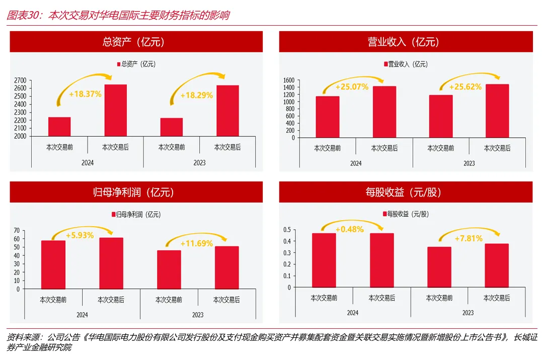即期业绩显著增厚,资本市场投资价值有望进一步提升。被注入资产普遍盈利能力强、现金流健康,并表后直接提升了公司资产规模、营业收入、归母净利润水平和每股收益(以2024年财务情况为例,交易后较交易前:总资产+18.37%、营业收入+25.07%、归母净利润+5.93%、基本每股收益+0.48%),有助于华电国际进一步完善境内常规能源资产布局范围、拓宽收入来源,分散整体经营风险。此外,通过将优质火电资产注入公司,可以充分借助资本市场价值发现机制打造中国华电集团旗舰常规能源上市公司,助力发挥火电在电网安全稳定运行及能源保供的重要作用,从而更好地服务国家能源安全战略。