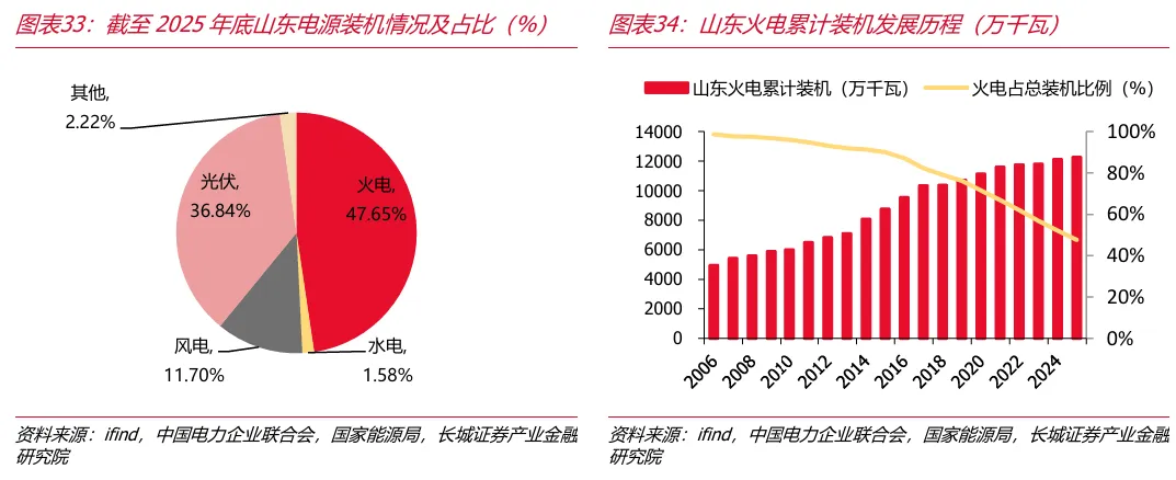 首先,山东是全国火电装机规模最大、地位最稳固的省份之一,其火电装机占据全国近8%的份额。根据ifind披露的中国电力企业联合会和国家能源局数据显示,截至2025年12月底,山东全省发电装机总容量达25742.87万千瓦,其中火电累计装机12266.33万千瓦,占比47.65%;光伏累计装机9484.90万千瓦,占比36.84%;风电累计装机3013.04万千瓦,占比11.70%;水电累计装机406.85万千瓦,占比1.58%。从历史演变看,在过去的二十年间,山东火电装机从2006年的4940万千瓦增长至2025年底的12266.33万千瓦,其中在“十四五”期间,仍有所上涨(2025年底较2020年底增长1131.33万千瓦),凸显了火电在山东电力系统中的压舱石地位。放眼全国来看,截至2025年底,山东火电装机占全国火电总装机的7.97%,在31个省市中排名第三,仅次于广东(13911.15万千瓦,占比9.04%)和内蒙古(12607.77万千瓦,占比8.19%),且在2022年及以前的多年间,山东火电装机一直位于全国第一。