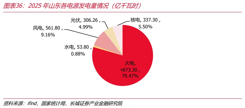 与此同时,山东是新能源快速崛起的先行者,但火电仍贡献近80%的发电量。截至2025年底,山东省风光发电装机合计达12497.94万千瓦[22],占比48.55%,首次超过火电(47.65%)。其中仅2021-2025年四年间,占比由2021年底的30.49%(其中:风电装机1942万千瓦,占比11.20%;光伏装机3343.40万千瓦,占比19.29%)历史性提升了18.06pct。截至2025年底,山东省光伏装机达9484.90万千瓦,连续8年保持全国第一[23]。但随着新能源装机量快速增长,山东绿电消纳问题加剧。从2025年山东省各电源发电量来看,火电仍是主导,贡献4873.30亿千瓦时的发电量,占山东省总发电量的79.46%,而风电/光伏仅分别贡献561.80亿千瓦时/306.26亿千瓦时的发电量,分别占总发电量的9.16%/4.99%。