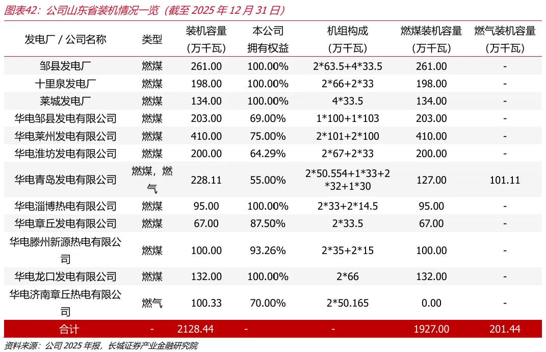 山东不仅是华电国际的发源地,更是公司业绩的“稳定器”与战略大本营。华电国际前身山东国际电源开发股份有限公司于1994年在济南成立,深耕齐鲁三十余载,公司在此积累了深厚的运营根基、市场影响力,享有得天独厚的资源禀赋。经过持续发展与战略扩张,截至2025年12月31日,公司在山东省的控股装机容量达到2,128.44万千瓦,占公司总装机容量的27.31%,是公司规模最大、根基最深的区域市场。其中,燃煤机组装机1927.00万千瓦,燃气机组装机201.44万千瓦,形成了以高效煤电为基石、燃气为补充的多元化电源结构。2025年底,公司全资子公司华电龙口发电有限公司投资建设的龙口四期2×66万千瓦热电联产项目第二台机组正式投运,两台66万千瓦超超临界机组全部建成,进一步强化了公司在山东区域的装机规模与保供能力[25]。