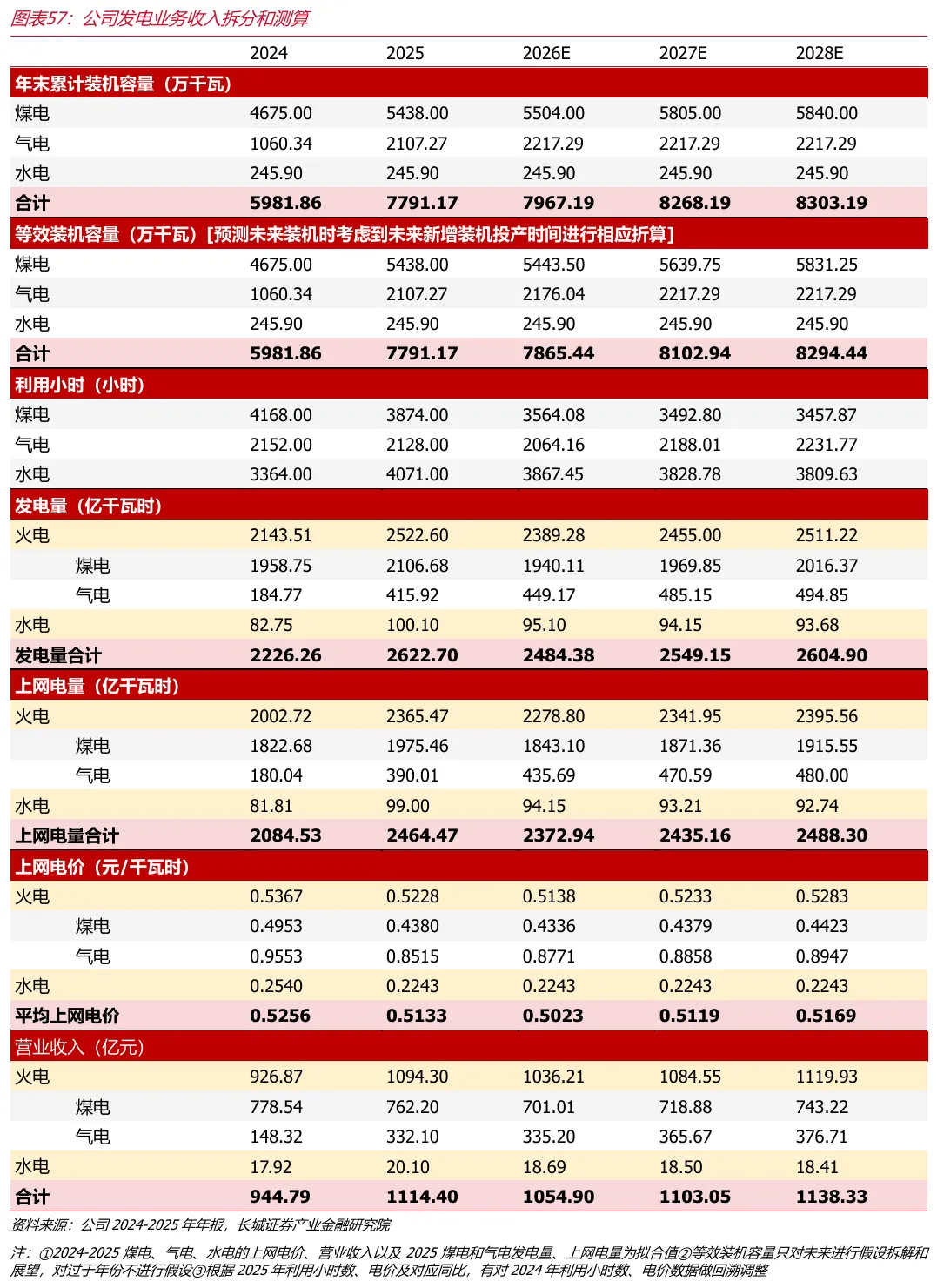 基于上述假设,我们预计2026-2028年公司发电业务收入分别为1054.90亿元、1103.05亿元、1138.33亿元。其中煤电2026-2028年收入预计为701.01亿元、718.88亿元、743.22亿元;气电2026-2028年收入预计为335.20亿元、365.67亿元、376.71亿元;水电2026-2028年收入预计为18.69亿元、18.50亿元、18.41亿元。