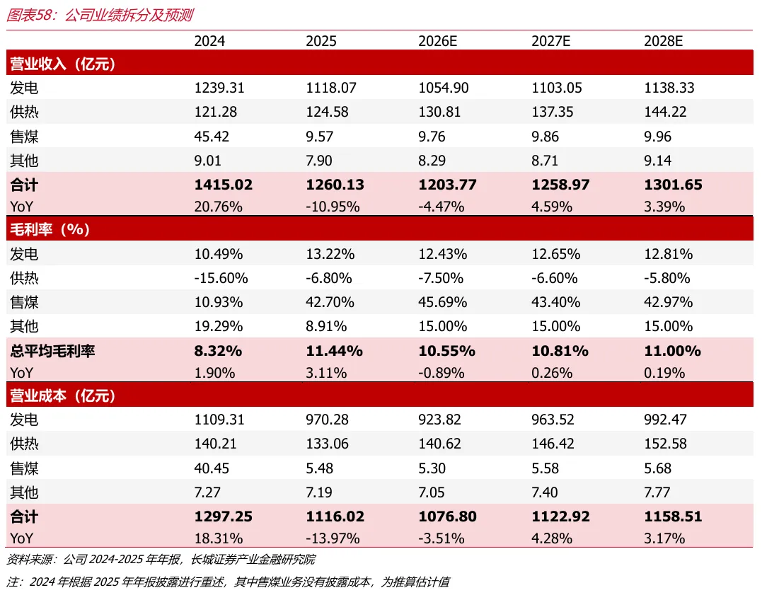 营业收入:1)发电:参考上述具体拆分测算。2)供热:供热需求具备刚性特征,预计2026-2028年收入保持小幅稳定增长。3)售煤:预计2026-2028年预计将保持相对稳定。4)其他:涵盖公司各种新兴业务,基数小预期小幅稳步增长。