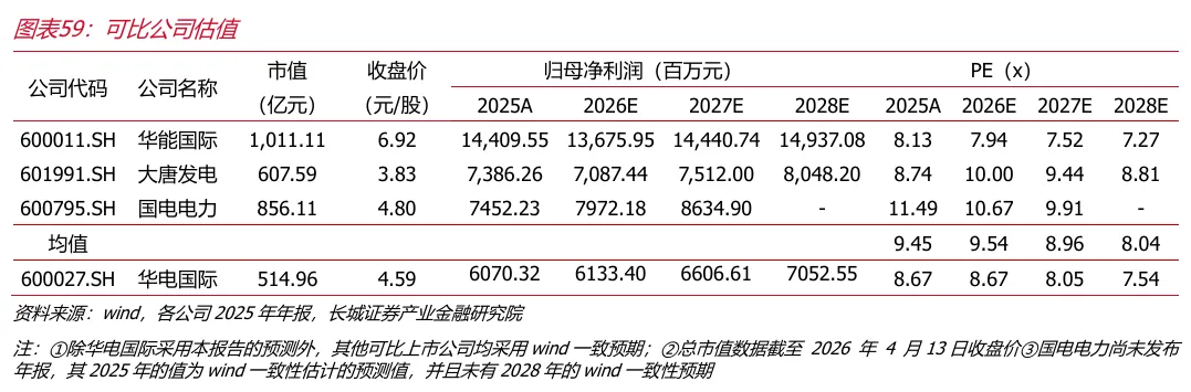 我们预计2026-2028年公司营业收入分别为1203.77亿元、1258.97亿元、1301.65亿元,同比-4.5%、+4.6%、+3.4%,实现归母净利润61.33亿元、66.07亿元、70.53亿元,同比+1.0%、+7.7%、+6.7%,对应EPS分别为0.53、0.57、0.61元,当前股价对应的PE倍数为8.7X、8.0X、7.5X,我们选取了华能国际、大唐发电、国电电力作为可比公司【选取原因:华电国际、华能国际、大唐发电、国电电力都属于五大电力集团,均以常规能源发电为主营业务,且发电资产遍布全国】,参考可比公司估值均值(2026-2028年为9.5X、9.0X、8X),具有较高性价比,维持“买入”评级。