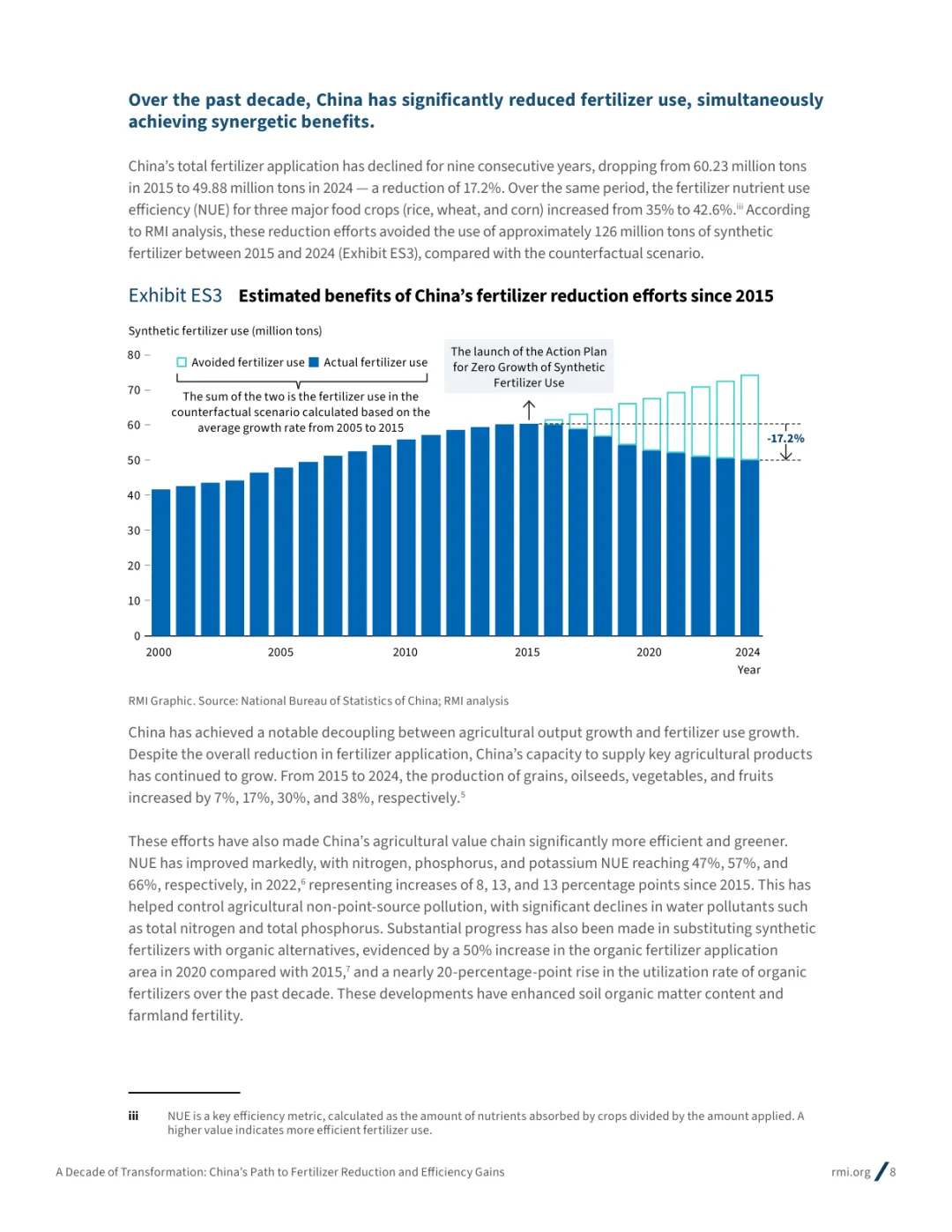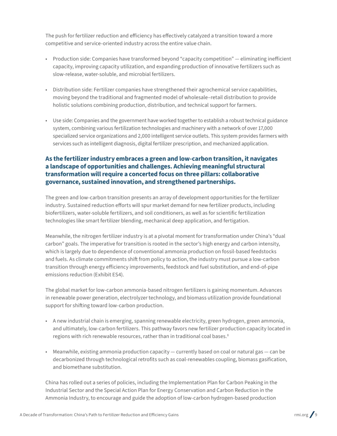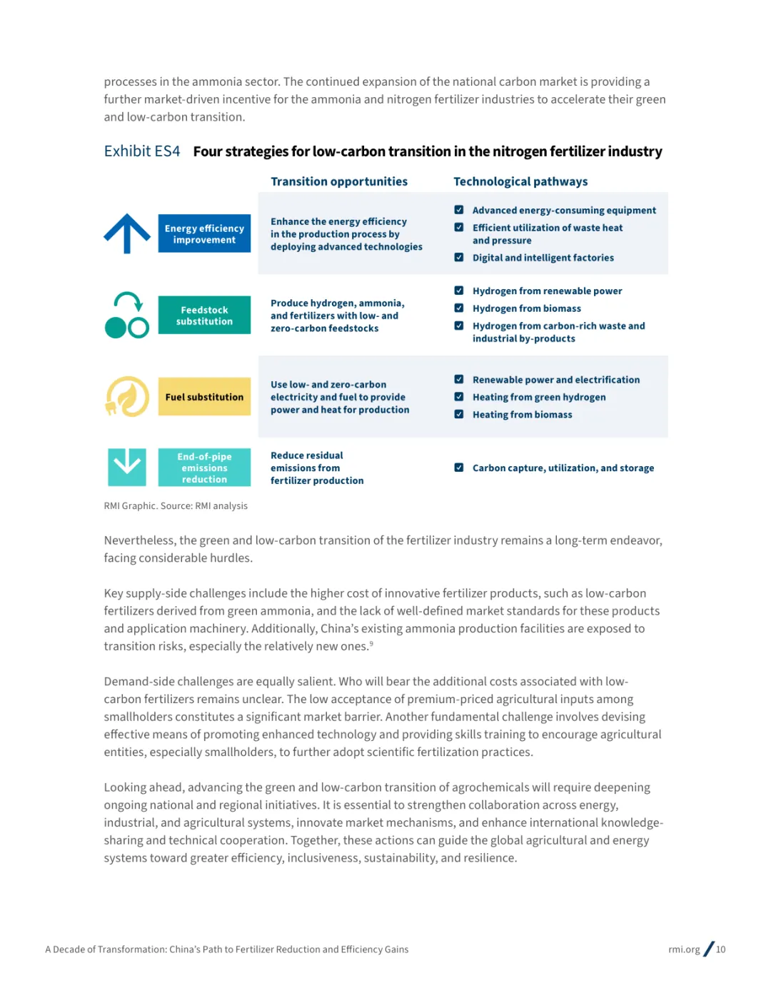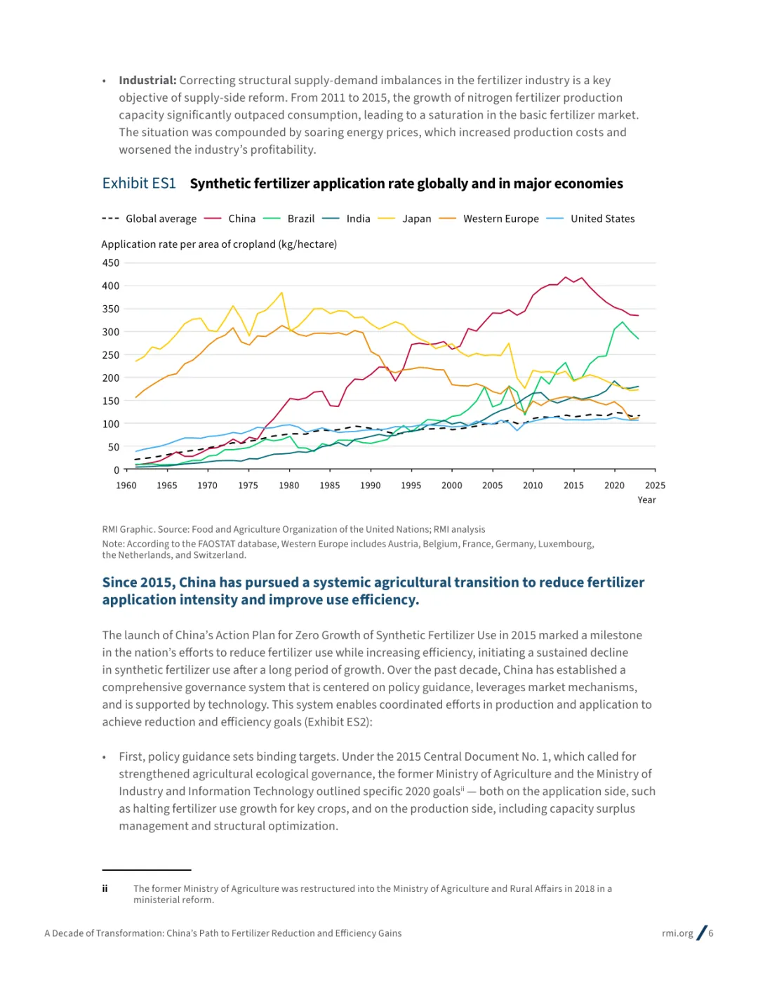 报告梳理中国化肥减量增效十年实践路径,解析化肥行业低碳转型的核心逻辑与实践成效。化肥生产与过度施用带来高能耗与生态压力,氮素生产依赖化石能源,农田氮流失引发温室气体排放与水土环境问题。中国作为全球最大化肥生产与消费国,推动减量增效具备全局意义。2015 年化肥使用量零增长行动开启行业转型序幕。政策设定刚性减量目标,行业推进市场化改革,淘汰落后产能,优化产品结构。农户与企业协同推进精准施肥、配方优化、模式升级与有机肥替代四大技术路径。十年间化肥施用总量连续九年下降,三大粮食作物养分利用率显著提升,粮食与经济作物产量保持稳步增长。农业面源污染得到有效管控,土壤质量持续改善。行业从规模扩张转向技术与服务升级,缓释肥、水溶肥、微生物肥等绿色产品占比提升。低碳化肥产业链逐步成型,绿氢、绿氨等技术为生产端脱碳提供支撑。行业仍面临新型肥料成本偏高、标准不完善、小农户接受度不足等问题。多方协同推进技术创新、市场机制完善与国际合作,可推动化肥行业全面实现绿色低碳高质量发展。