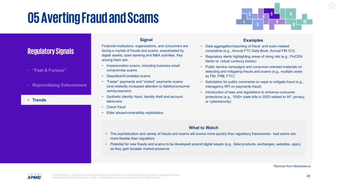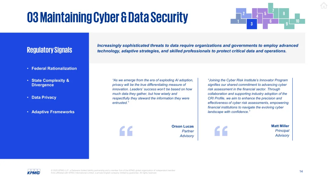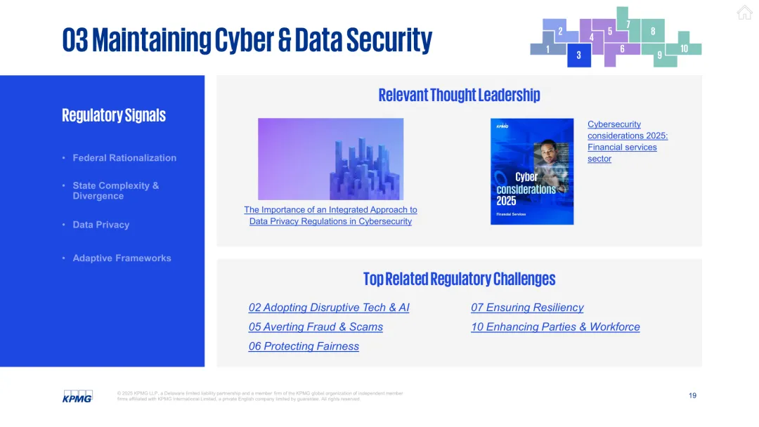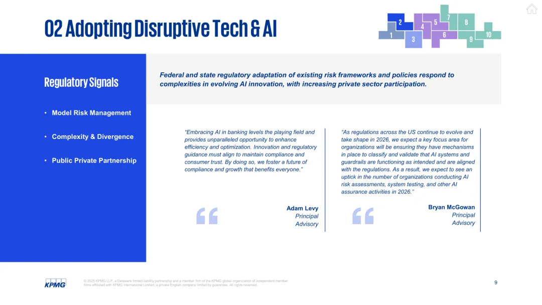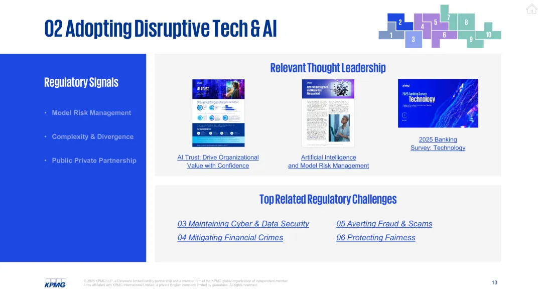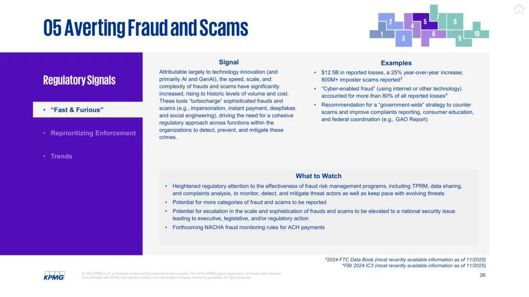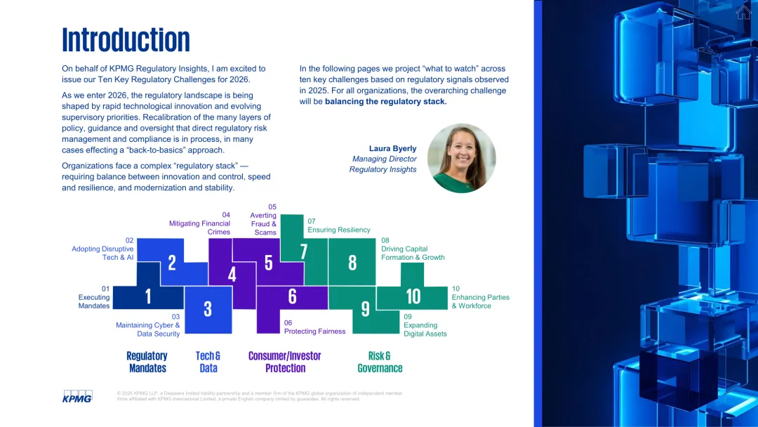 导读:报告聚焦 2026 年全球监管体系平衡问题,梳理出十大核心监管挑战。监管框架进入调整阶段,政策层回归核心法定职责,推动合规与创新协同发展。AI 技术应用推动监管模式革新,模型风险管理体系持续优化,联邦与地方监管规则呈现差异化特征。政企合作搭建创新沙盒,为技术落地提供合规空间。网络与数据安全受到高度重视,跨部门协同机制逐步完善,地方立法数量快速增长,数据隐私与儿童信息保护标准持续提升。金融犯罪防控转向风险导向模式,监管资源聚焦高风险领域,制裁措施成为重要治理工具。欺诈防范应对 AI 驱动的新型诈骗行为,执法重点指向侵害公众权益的违法行为。公平性监管覆盖服务准入、算法公正与权益保护,减少决策中的偏见因素。行业运营韧性建设涵盖业务持续计划、技术关联风险与资本流动性管理。资本市场鼓励直接融资与创业创新,数字资产监管框架逐步清晰,稳定币与代币化资产迎来规范化发展。第三方风险管理与人才体系建设成为行业长效发展的重要支撑。