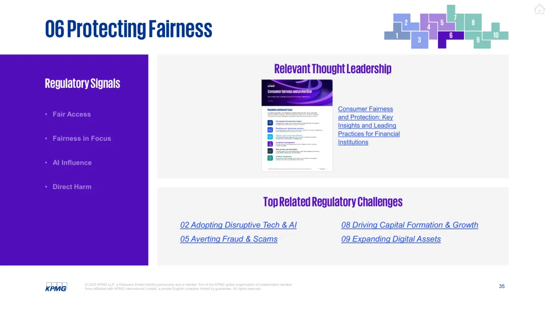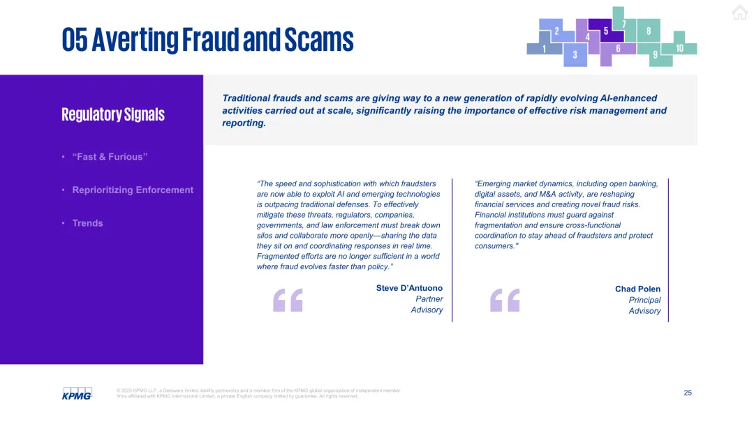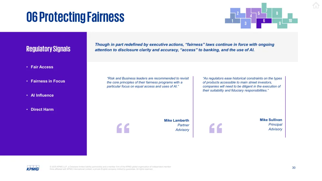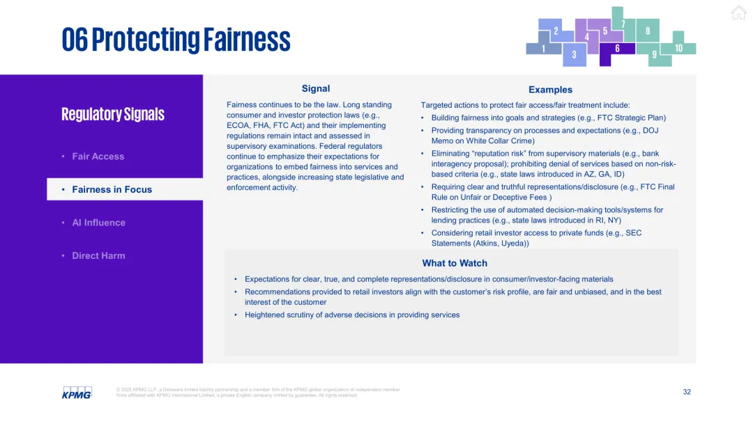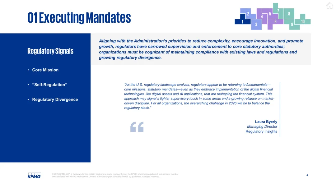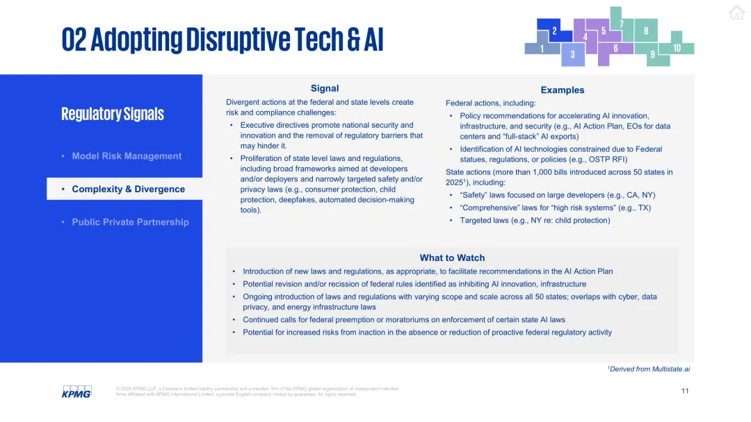 导读:报告聚焦 2026 年全球监管体系平衡问题,梳理出十大核心监管挑战。监管框架进入调整阶段,政策层回归核心法定职责,推动合规与创新协同发展。AI 技术应用推动监管模式革新,模型风险管理体系持续优化,联邦与地方监管规则呈现差异化特征。政企合作搭建创新沙盒,为技术落地提供合规空间。网络与数据安全受到高度重视,跨部门协同机制逐步完善,地方立法数量快速增长,数据隐私与儿童信息保护标准持续提升。金融犯罪防控转向风险导向模式,监管资源聚焦高风险领域,制裁措施成为重要治理工具。欺诈防范应对 AI 驱动的新型诈骗行为,执法重点指向侵害公众权益的违法行为。公平性监管覆盖服务准入、算法公正与权益保护,减少决策中的偏见因素。行业运营韧性建设涵盖业务持续计划、技术关联风险与资本流动性管理。资本市场鼓励直接融资与创业创新,数字资产监管框架逐步清晰,稳定币与代币化资产迎来规范化发展。第三方风险管理与人才体系建设成为行业长效发展的重要支撑。