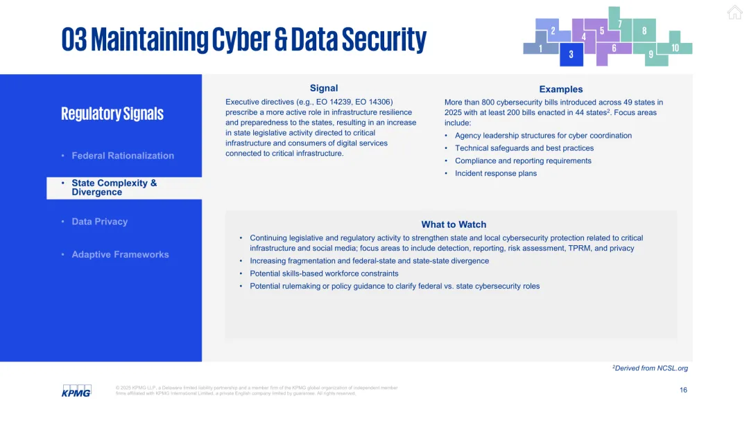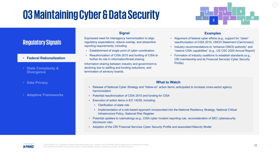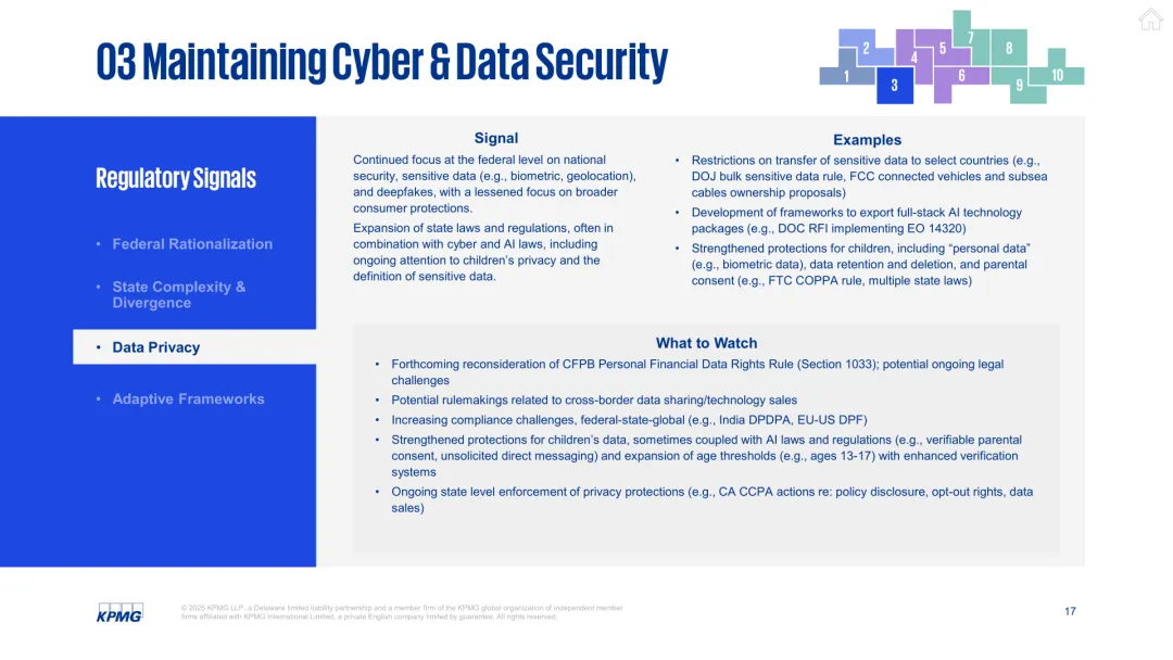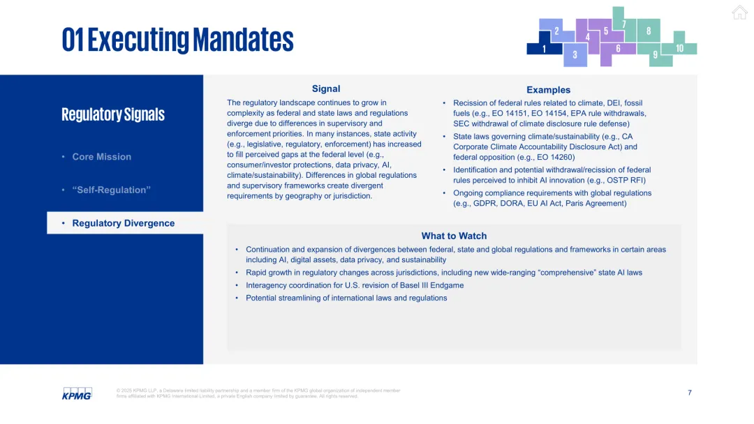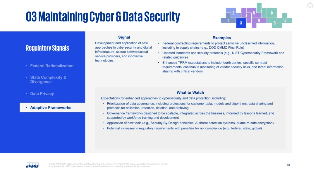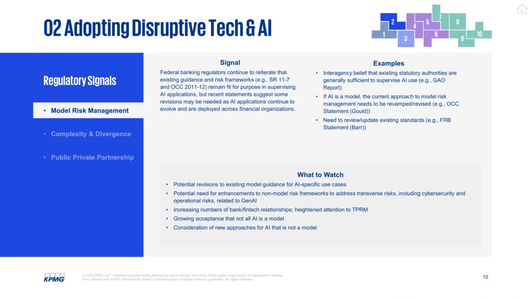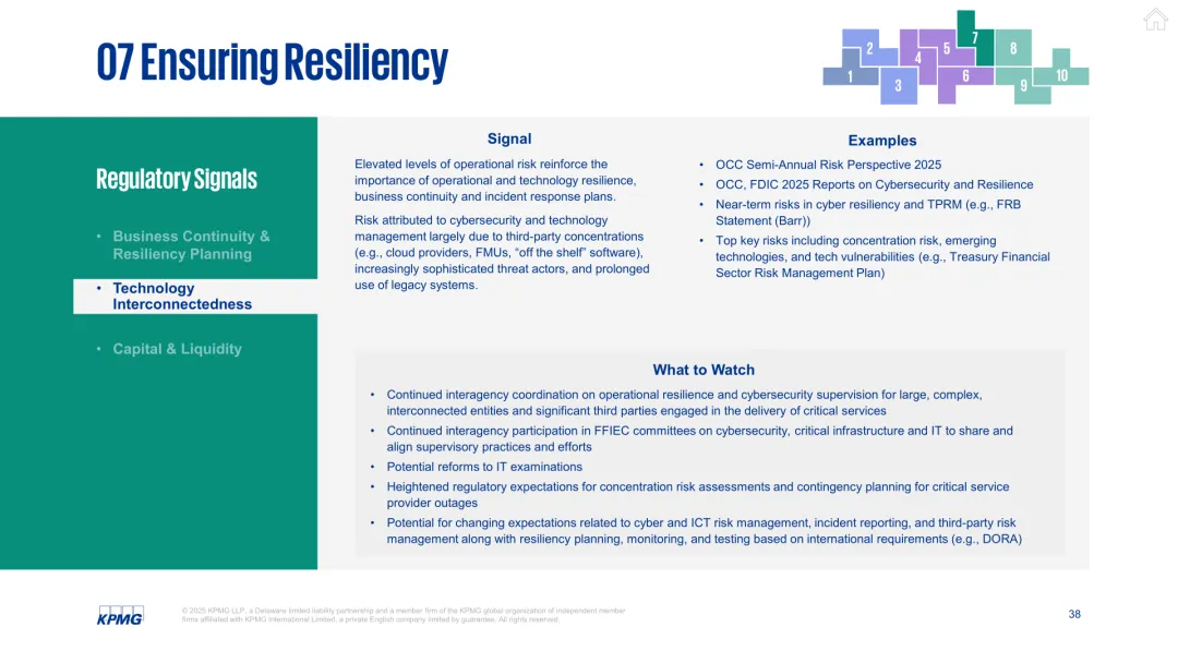 导读:报告聚焦 2026 年全球监管体系平衡问题,梳理出十大核心监管挑战。监管框架进入调整阶段,政策层回归核心法定职责,推动合规与创新协同发展。AI 技术应用推动监管模式革新,模型风险管理体系持续优化,联邦与地方监管规则呈现差异化特征。政企合作搭建创新沙盒,为技术落地提供合规空间。网络与数据安全受到高度重视,跨部门协同机制逐步完善,地方立法数量快速增长,数据隐私与儿童信息保护标准持续提升。金融犯罪防控转向风险导向模式,监管资源聚焦高风险领域,制裁措施成为重要治理工具。欺诈防范应对 AI 驱动的新型诈骗行为,执法重点指向侵害公众权益的违法行为。公平性监管覆盖服务准入、算法公正与权益保护,减少决策中的偏见因素。行业运营韧性建设涵盖业务持续计划、技术关联风险与资本流动性管理。资本市场鼓励直接融资与创业创新,数字资产监管框架逐步清晰,稳定币与代币化资产迎来规范化发展。第三方风险管理与人才体系建设成为行业长效发展的重要支撑。