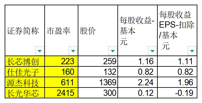 源杰科技达到51倍。最低的长光华芯也有18倍。长芯博创和仕佳光子都是30多倍。