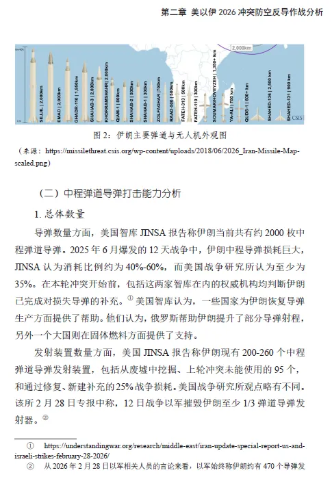 第二章聚焦伊朗远程打击与以色列防空反导作战。在这场战争中,防空反导成为核心对抗领域,决定着战争进程与未来走向。文章在梳理伊朗军队导弹及无人机打击能力与以色列军队(及美国支援)防空反导体系的基础上,结合双方既往多轮直接攻防实战情况,综合分析了本轮冲突中双方攻防策略与作战成效。