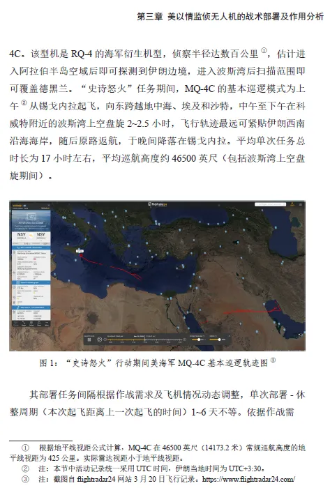 第三章聚焦美以联军情报力量,以情监侦无人机为研究对象,探索美以无人监视资产在现代战争对抗性空域中的能力与作用。文章首先梳理主要参战情监侦无人机的型号、性能参数与编制驻地等信息,简要展示美以无人监视兵力及规模;然后依托开源情报飞行记录及击落记录,分析各型情监侦无人机的部署情况及应用特点;最后结合击落数据及具体案例,针对美以情监侦无人机在伊朗作战部署的不足进行了分析。针对中空无人机等小型目标,本章研究工作采用“以击落记录反推部署模式”的分析方式,为缺乏公开追踪记录的目标进行战术部署研究分析提供了参考。