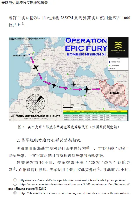 附件1收录了一篇很有价值的文章。该文较为系统且详细地梳理了美军航空兵集结及各方首日作战情况,回顾了诸多行动细节,包括美各军种航空兵的集结、斩首行动、压制敌防空行动、削弱伊朗弹道导弹能力以及伊朗的报复性打击行动等。事实表明,首个作战日的交锋,不仅确立了双方对抗的激烈程度,更奠定了塑造此次冲突走向的战略不对称格局,也为后续地区局势发展埋下伏笔。
