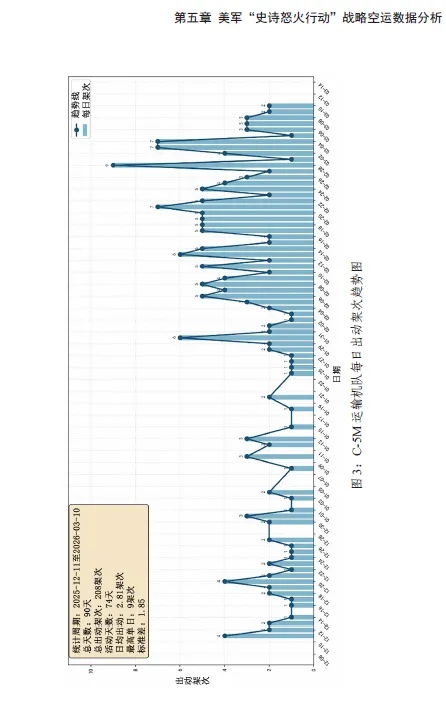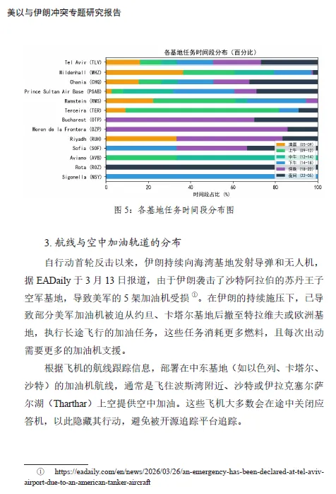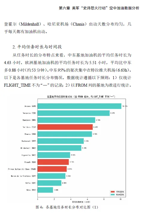 第六章聚焦美军空中加油行动。在“史诗怒火”行动中,加油机部队不仅承担战斗机跨区机动伴随保障任务,还在作战空域内提供持续的空中加油,对整体作战节奏与效能具有决定性影响。文章通过处理8000条美军空中加油机飞行记录数据(截至2026年3月24日),并围绕加油机部署规模、基地分布、任务时长、日均出动架次及空中加油轨道分布等指标进行系统分析,力图从数据层面还原其在行动中的部署与运行模式,为进一步评估空中支援能力提供了数据支撑。