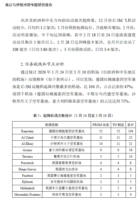 第五章聚焦美军战略空运行动,通过对近万条C-5M和C-17A运输机飞行记录进行梳理、分析和挖掘,旨在回答一个核心问题——在当前作战条件下,美军战略空运能力究竟发挥了多大效能?研究过程中,从数据分析角度系统刻画战略运输机出动率、飞行航线和节点、出动架次和运输量、飞机使用强度等指标,从而量化了其对战役持续保障能力的支撑效果。
