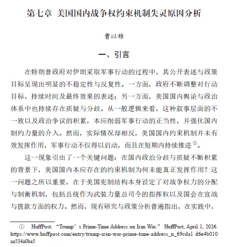 第七章围绕“美国国内战争权约束机制未能对特朗普政府发挥有效作用”这一核心问题展开,分析重点不在于制度是否存在,而在于制度为何在关键决策节点未能形成实际约束。文章从制度结构、政治运行与战略认知三个层面构建解释框架,将制度运行与政治结构、认知环境相结合,揭示了约束机制“形式存在但实质弱化”的内在逻辑,突破了单纯从宪制设计解释战争权问题的既有路径。文章的现实意义在于,为理解美国在有限战争与灰色地带冲突中的决策模式提供解释框架,并为评估未来美国对外用兵行为提供重要参考。