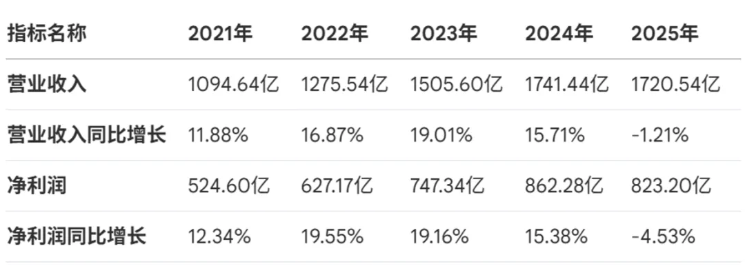 2025年,营收和净利润分别为1720.54亿元、853亿元,同比分别下降1.2%、4.5%,业绩指标出现微幅下调。