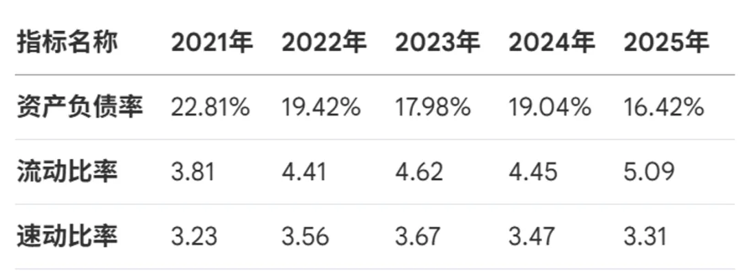2025年,资产负债率为16.42%,同比下降2.62%。近五年,呈稳步下降趋势。