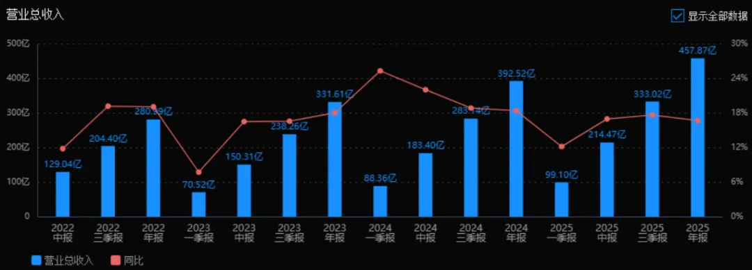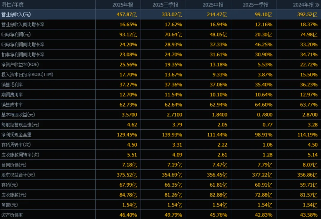 2025年营业总收入为 457.87亿元,相较于2024年的392.52亿元增长了 16.65%。评价:公司营收保持两位数稳健增长,增速略低于2024年的18.37%,但仍处于较快扩张阶段,显示出较强的市场拓展能力。